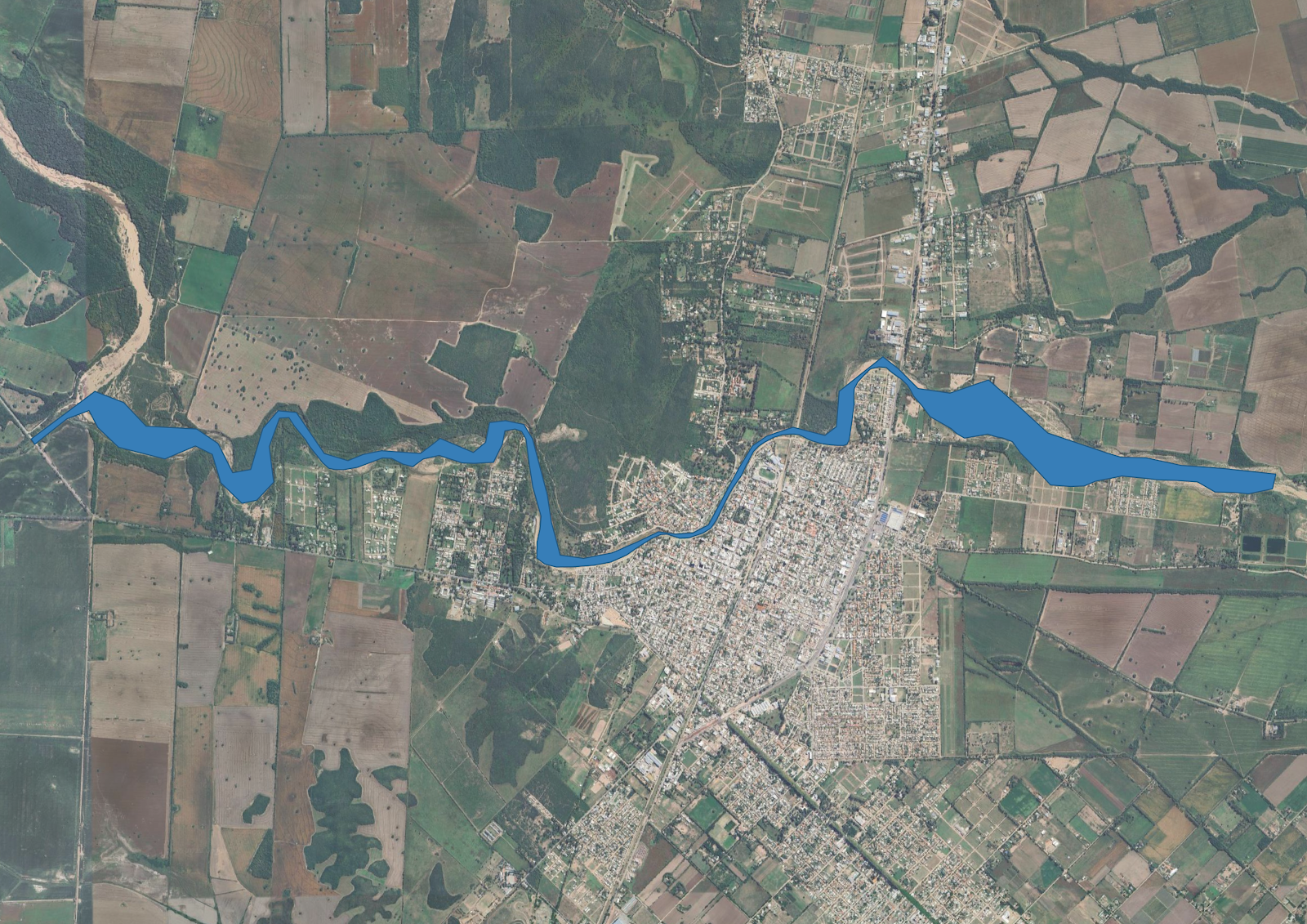 Este mapa muestra el curso del río Guanusacate a su paso por la ciudad de Jesús María, Córdoba. El río está representado por una línea azul que serpentea a través del paisaje. |