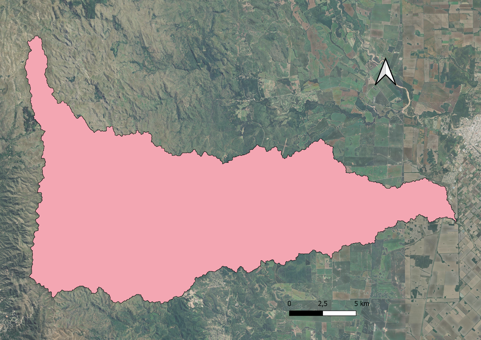 Este mapa muestra la delimitación de la cuenca hidrográfica del río Carnero en la provincia de Córdoba. La cuenca está representada por un polígono de color rosa en el mapa. |