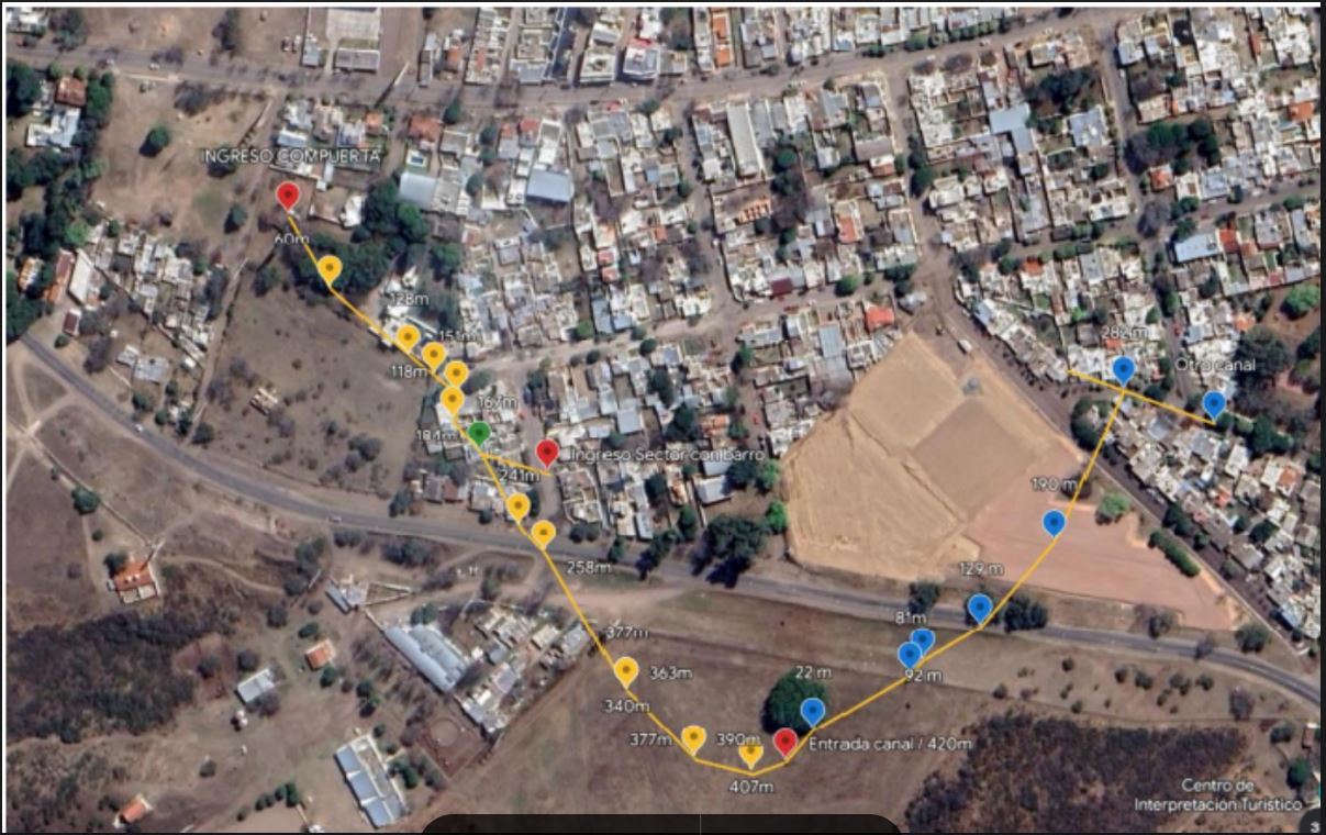 Este mapa muestra el trazado del canal principal en la ciudad de Jesús María, Córdoba. El canal está representado por una polilínea de color amarillo con marcadores de distancia en metros. Se incluyen puntos de referencia como el "Ingreso Compuerta", el "Ingreso Sector Cotarro" y la "Entrada Canal". También se indica la ubicación del Centro de Interpretación Turístico. |