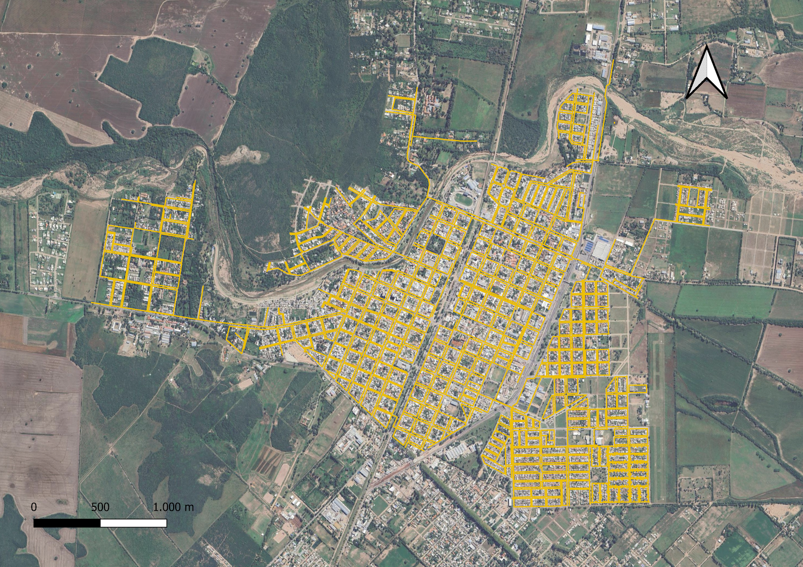 Este mapa muestra la traza de la red de distribución de gas natural en la ciudad de Jesús María, Córdoba. Las líneas amarillas representan las tuberías de la red de gas. |