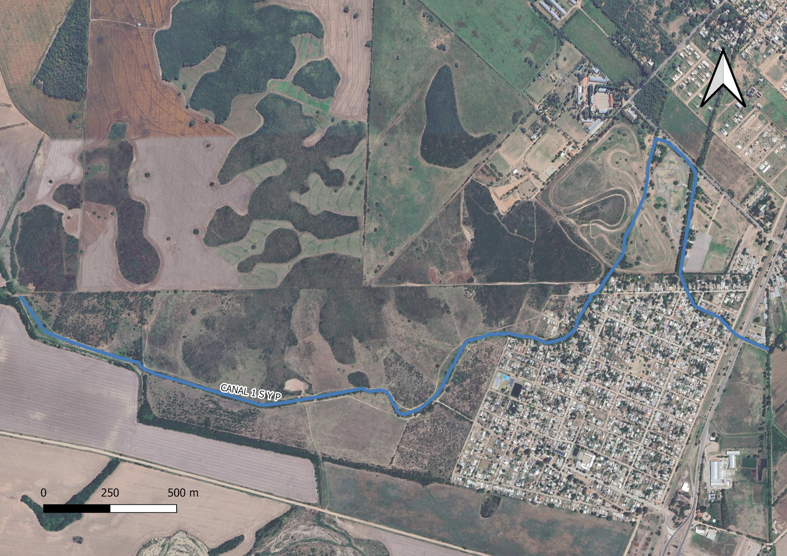 Este mapa muestra el trazado del canal Sierras y Parque a su paso por la ciudad de Jesús María, Córdoba. El canal está representado por una línea azul sobre una imagen satelital de fondo. |