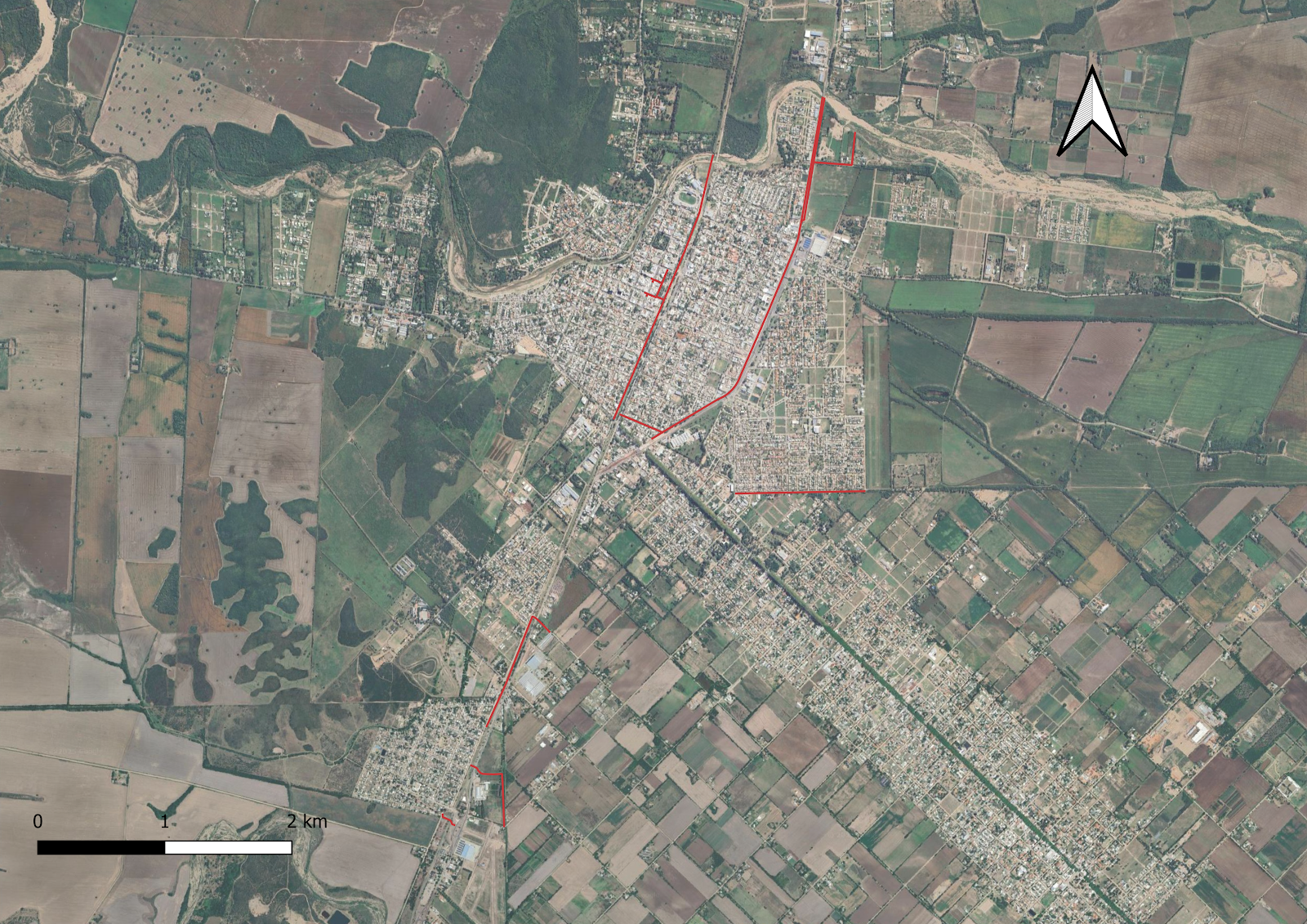 Este mapa muestra la traza de la red de desagües pluviales en la ciudad de Jesús María, Córdoba. Las líneas rojas representan las tuberías de la red de desagües, que recogen y conducen el agua de lluvia para evitar inundaciones. |