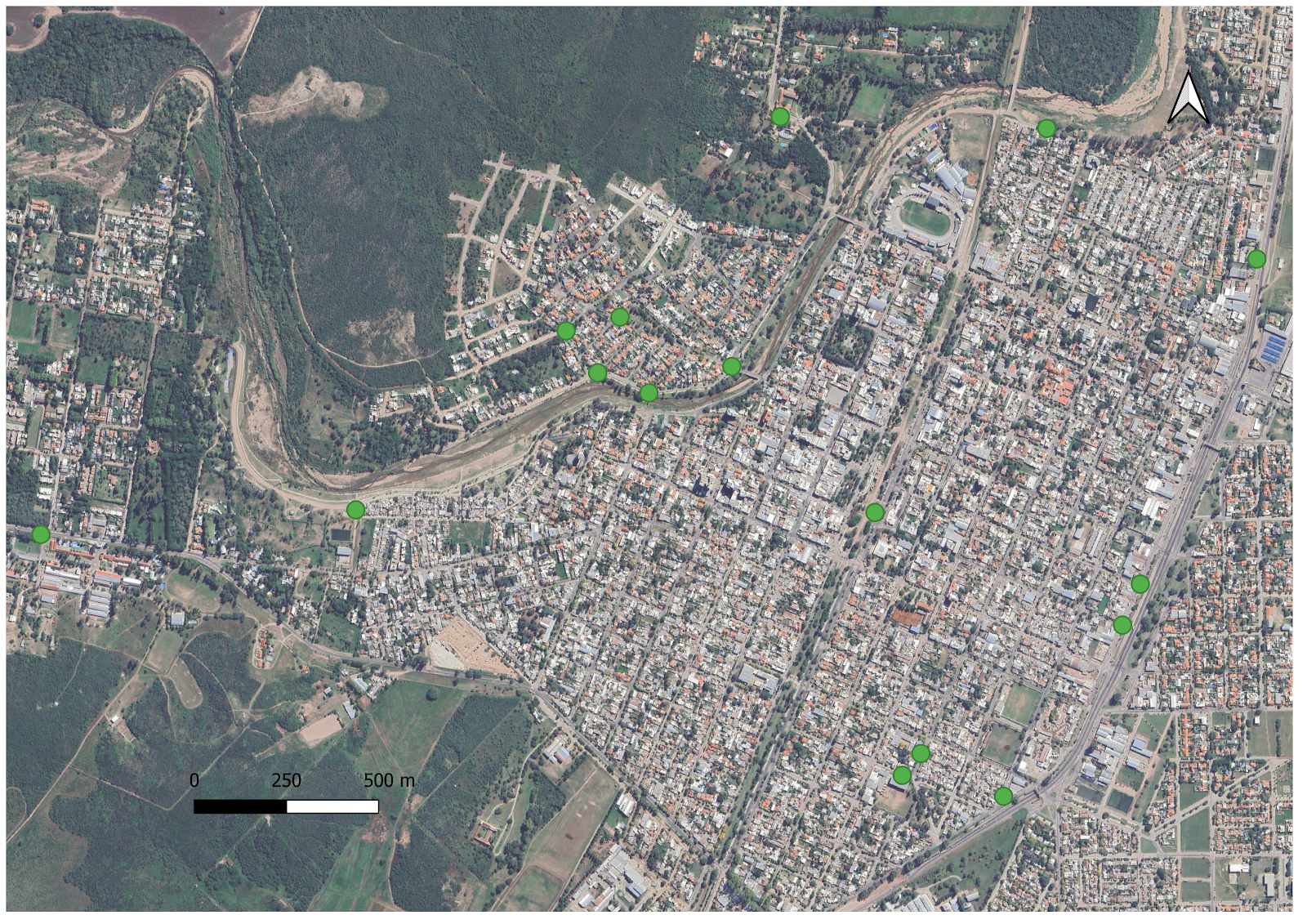 Este mapa muestra la ubicación de los contenedores de residuos sólidos urbanos (RSU) en la ciudad de Jesús María, Córdoba. Cada contenedor está representado por un punto verde en el mapa. |