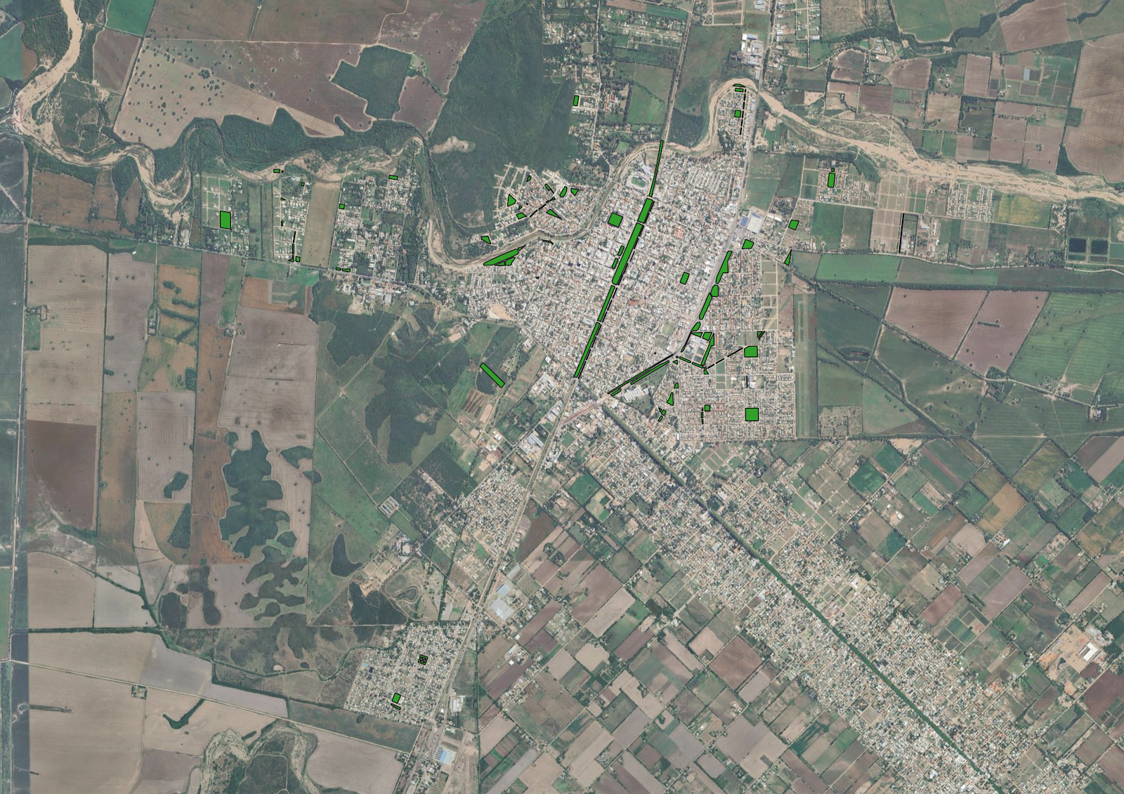 Este mapa muestra la ubicación de los espacios verdes públicos en la ciudad de Jesús María, Córdoba. Cada espacio verde está representado por un polígono verde en el mapa. |