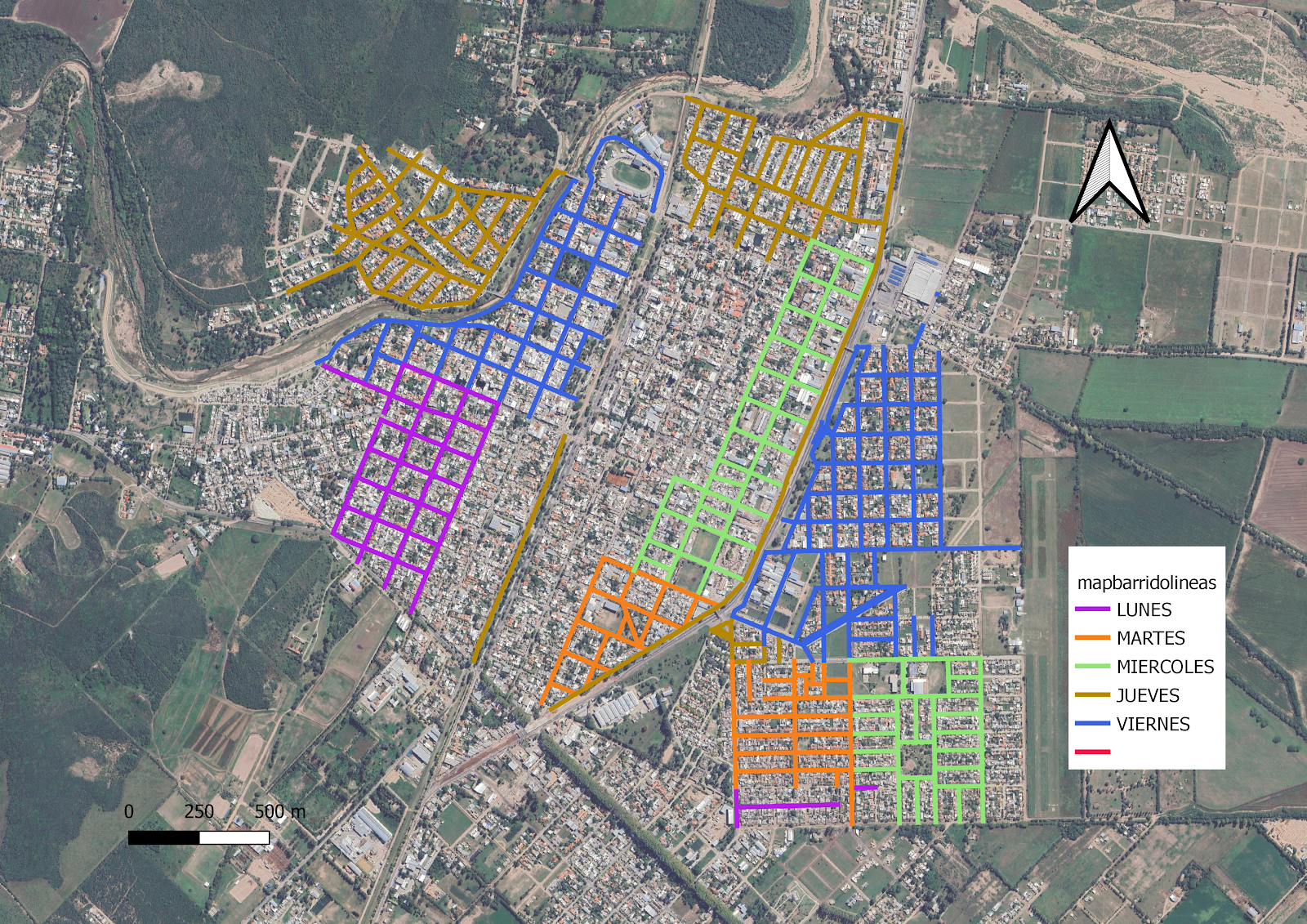 Este mapa muestra las zonas de servicio de barrido en la ciudad de Jesús María, Córdoba. Se diferencian dos tipos de servicio: barrido diario y barrido semanal (lunes). Cada zona está representada por un polígono con un color distintivo, indicando la frecuencia del servicio. |