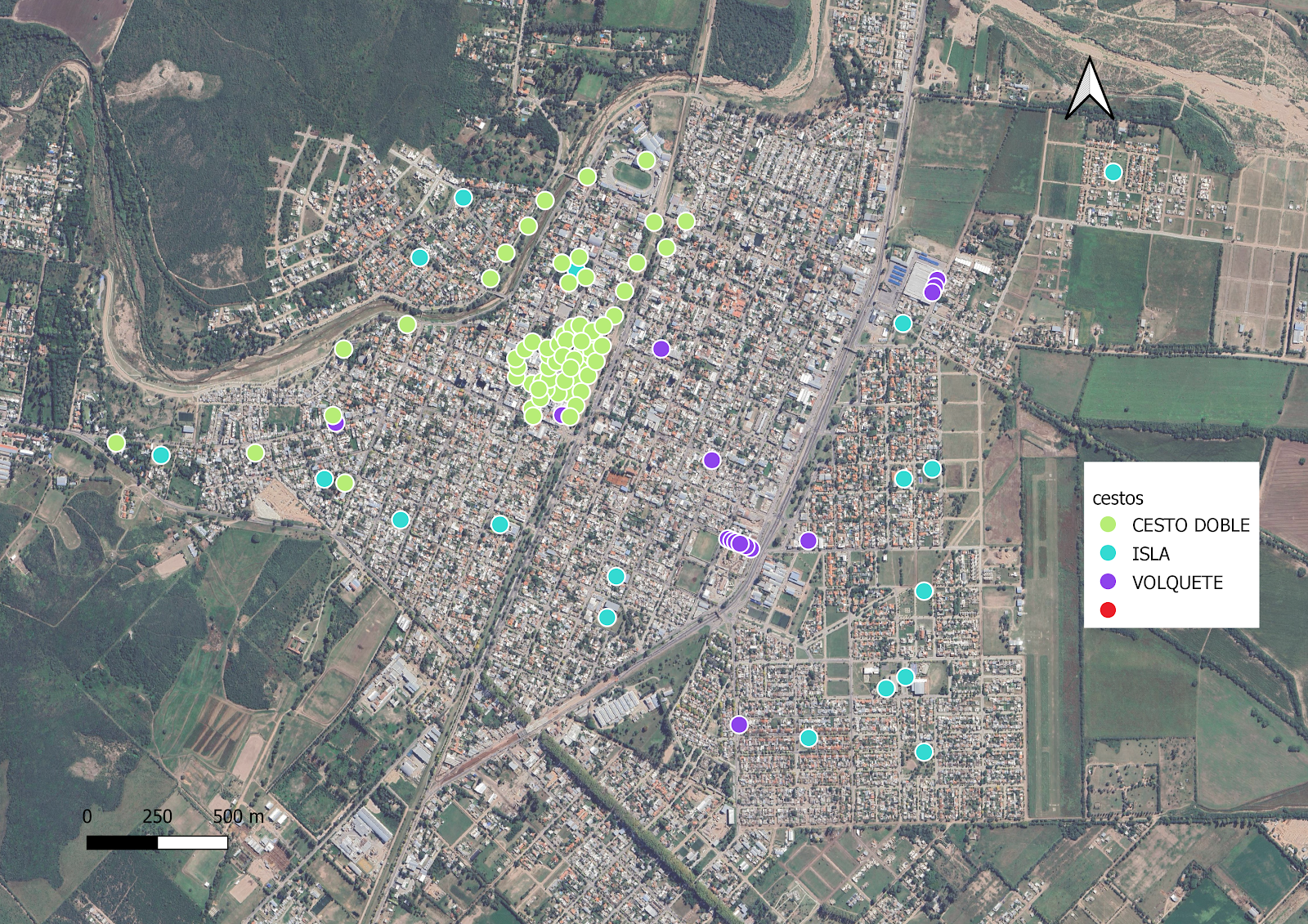 Este mapa muestra la ubicación de los proyectos de cestos de basura en la ciudad de Jesús María, Córdoba. Se diferencian tres tipos de proyectos: cestos dobles, islas de reciclaje y volquetes. Cada tipo de proyecto está representado por un punto con un color distintivo. |