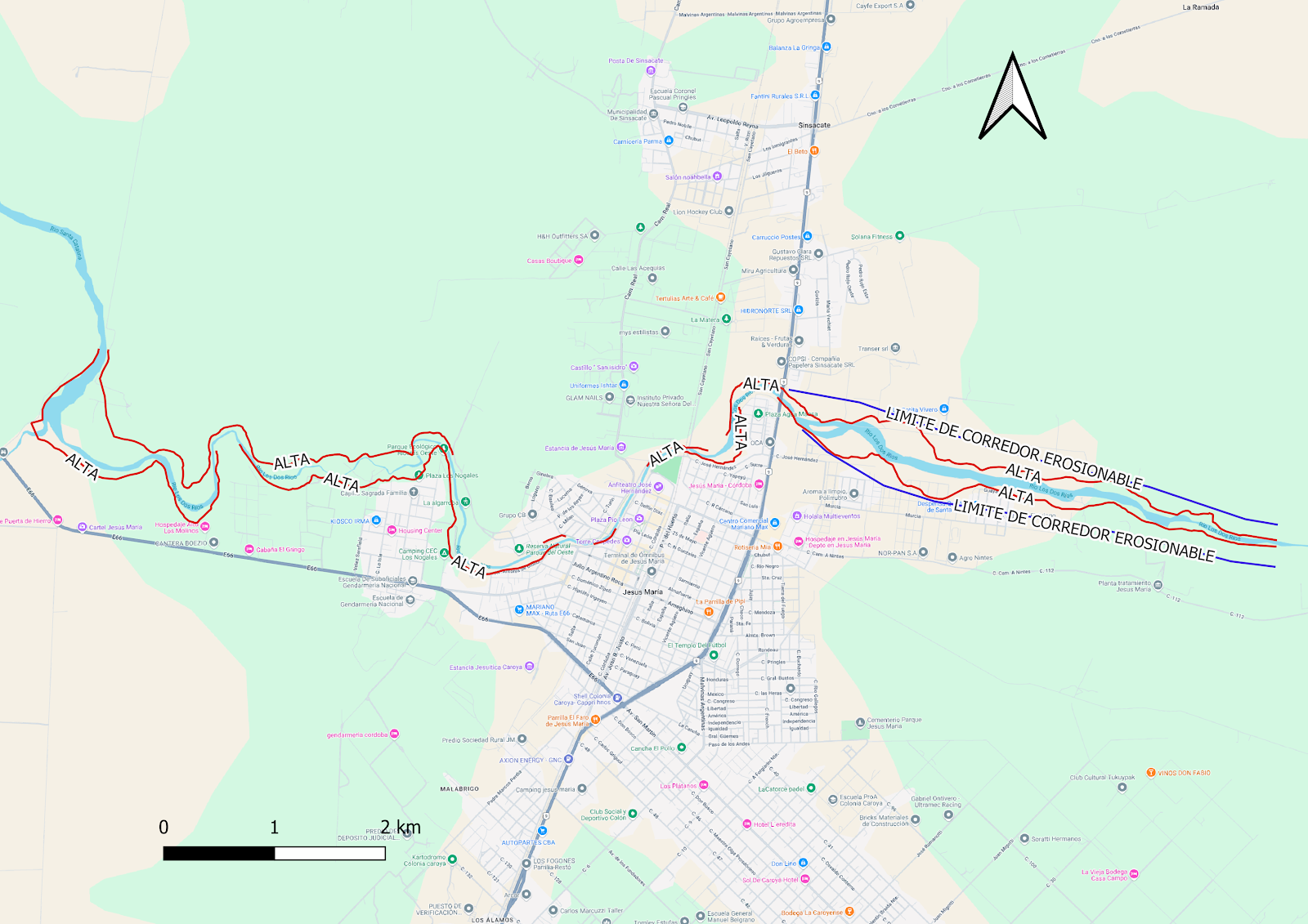 Este mapa muestra las zonas de amenaza de erosión en la ciudad de Jesús María, Córdoba. Las zonas de amenaza de erosión están representadas por líneas rojas y azules. Se incluye información sobre la ubicación y el tipo de amenaza de erosión (si está disponible). |
