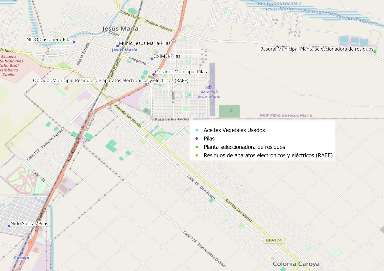 Este mapa muestra la ubicación de diferentes puntos clave para la gestión integral de residuos en la ciudad de Jesús María, Córdoba. Se identifican puntos de recolección de Aceites Vegetales Usados (AVUs), centros de acopio de Pilas, la ubicación de la Planta Seleccionadora de Residuos y el Obrador Municipal para Residuos de Aparatos Eléctricos y Electrónicos (RAEE). Cada tipo de punto está representado por un color diferente, según la leyenda incluida en el mapa. |