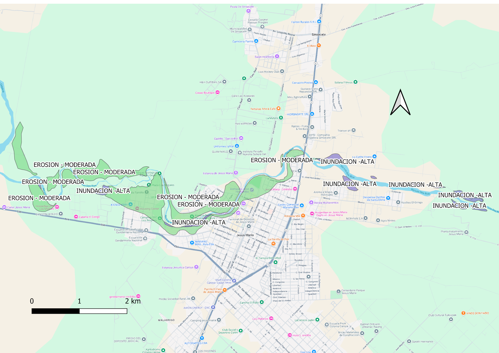 Este mapa muestra las zonas de amenaza por inundación en la ciudad de Jesús María, Córdoba. Las zonas de amenaza por inundación están representadas por áreas sombreadas en verde. Se incluye información sobre la ubicación y el nivel de amenaza por inundación (alto). |