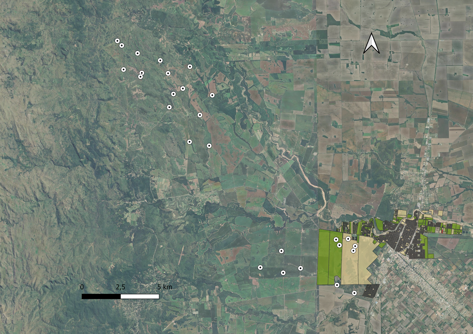 Este mapa muestra la ubicación de las lagunas de retardo en la ciudad de Jesús María, Córdoba. Las lagunas de retardo están representadas por puntos blancos. Se incluye información sobre la ubicación y el número de identificación de cada laguna. |
