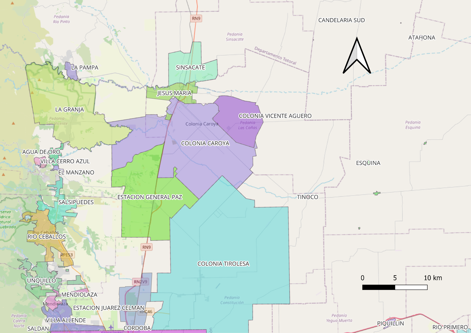 Este mapa delimita los radios urbanos de la ciudad de Jesús María, Córdoba. Los radios urbanos están representados por polígonos con límites definidos. La visualización puede incluir etiquetas con la identificación de cada radio urbano. |