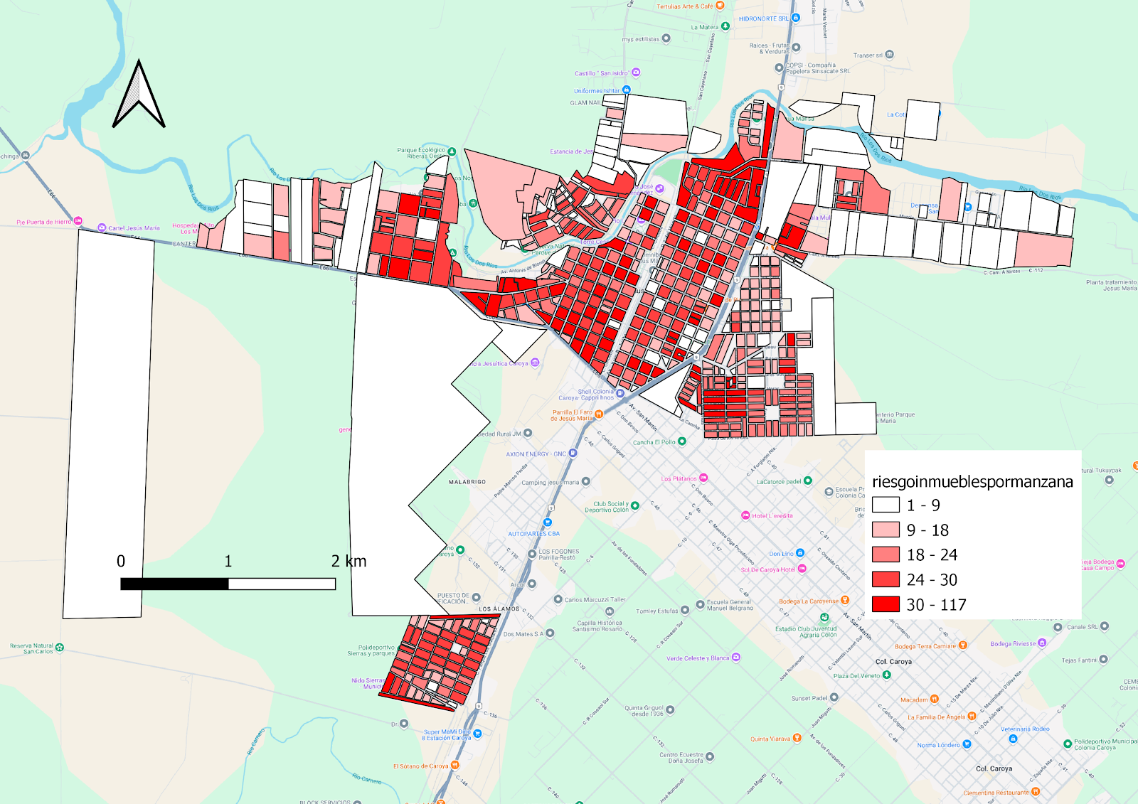 Este mapa muestra la cantidad de inmuebles por manzanas en la ciudad de Jesús María, Córdoba. La cantidad de inmuebles se representa mediante un gradiente de color, donde los tonos más oscuros indican mayor cantidad de inmuebles. Se incluye una leyenda con los rangos de cantidad de inmuebles por manzana. |
