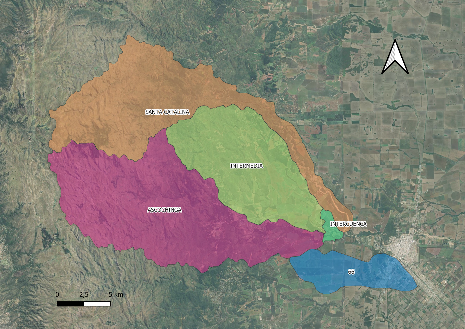 Este mapa muestra la delimitación de la cuenca del río Guanúsacate Salitre, incluyendo sus subcuencas: Santa Catalina, Ascochinga, Intermedia, Intercuenca y la subcuenca 66. Cada subcuenca está representada por un polígono con un color distintivo. |