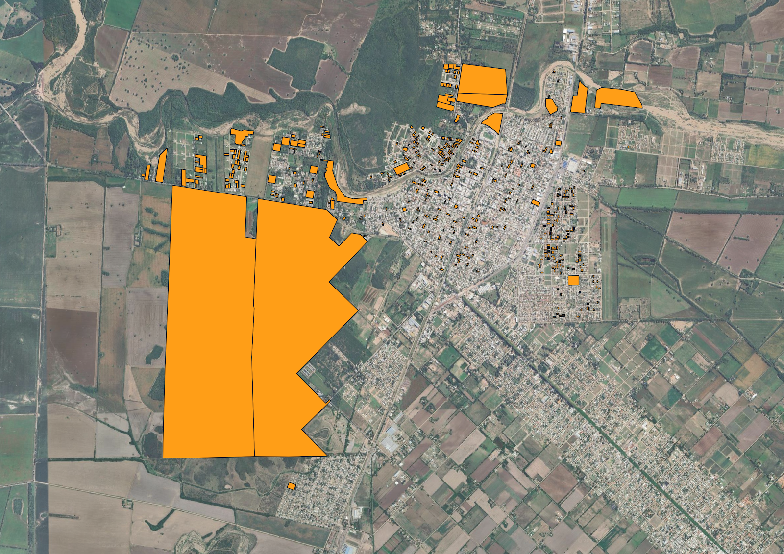 Este mapa muestra la ubicación de piletas (piscinas) en la ciudad de Jesús María, Córdoba. Las piletas están representadas por polígonos de color naranja. Se incluye una leyenda con la clasificación de las piletas por tipo (públicas, privadas, clubes, etc.). |