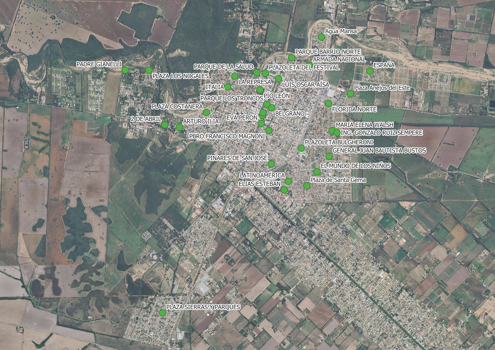 Este mapa muestra la ubicación de las plazas públicas en la ciudad de Jesús María, Córdoba. Cada plaza está representada por un punto en el mapa, y se incluye información sobre su nombre. |