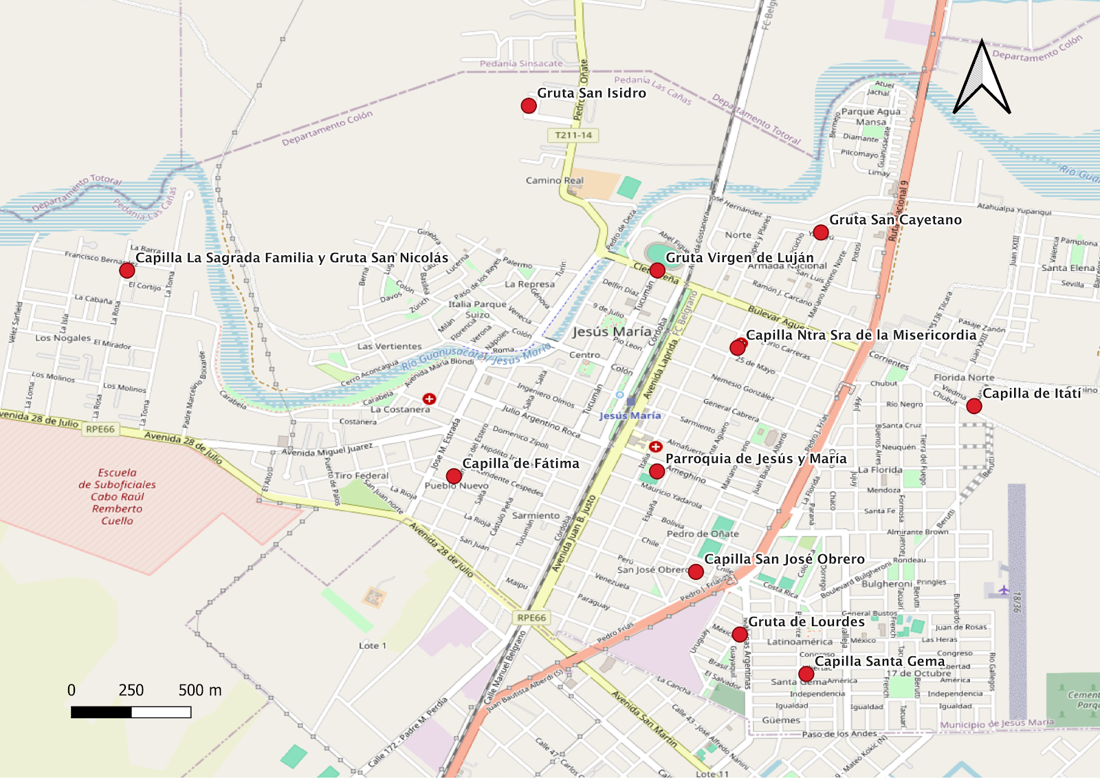 Este mapa muestra la ubicación de diversas edificaciones religiosas en la ciudad de Jesús María, Córdoba. Se incluyen iglesias, capillas y grutas religiosas, cada una marcada con un punto rojo y su respectivo nombre. |