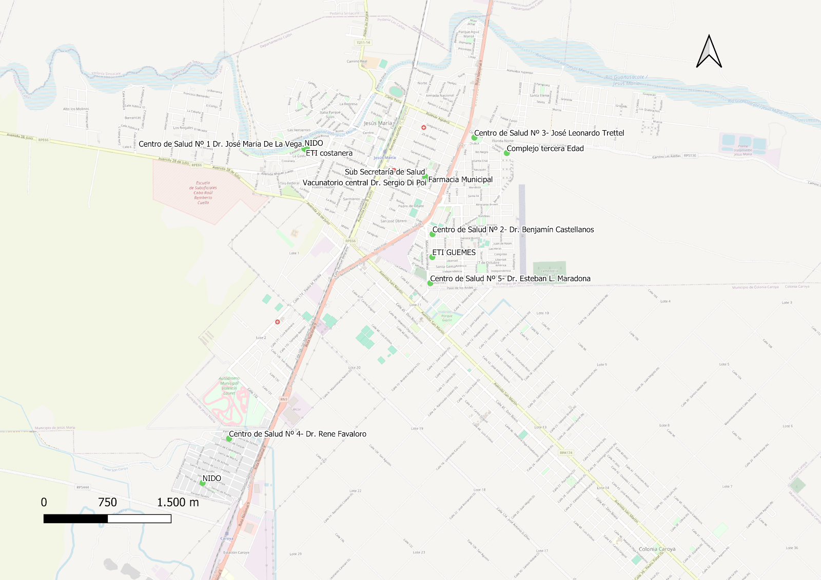 Este mapa muestra la ubicación de los dispensarios municipales de la ciudad de Jesús María, Córdoba. Cada dispensario municipal está representado por un punto en el mapa, y se incluye información sobre su nombre y función. |