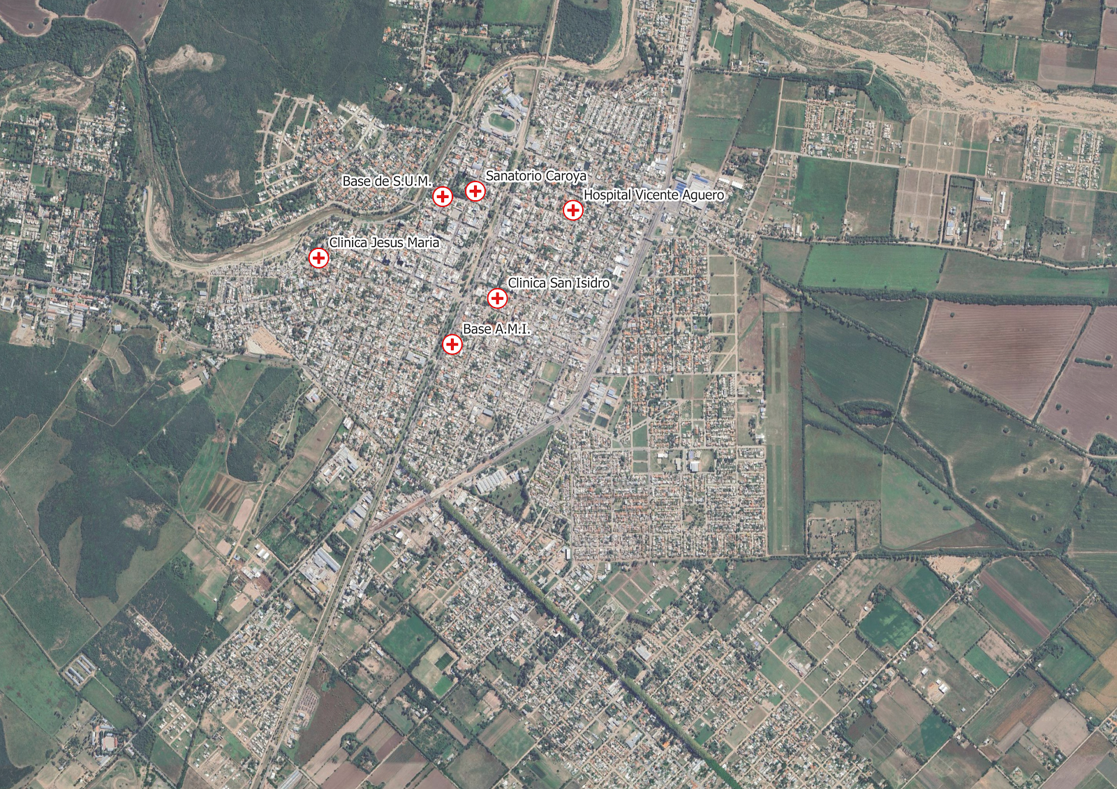 Este mapa muestra la ubicación de las principales dependencias de salud en la ciudad de Jesús María, Córdoba. Se incluyen hospitales, clínicas, sanatorios y bases de servicios de emergencia. Cada dependencia está representada por un punto con un símbolo distintivo. |