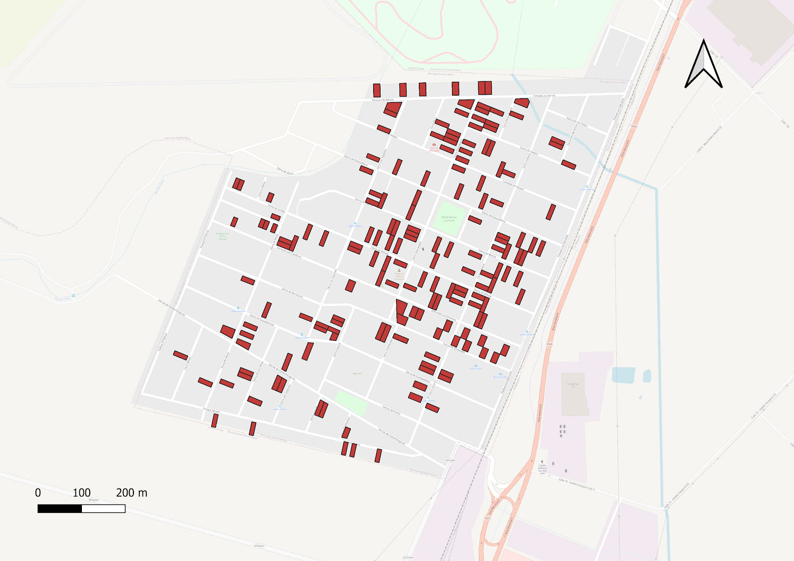 Este mapa muestra la ubicación de las viviendas encuestadas en el barrio Sierras y Parques de Jesús María, Córdoba, durante la realización de una encuesta de salud. Cada vivienda encuestada está representada por un polígono rojo. |