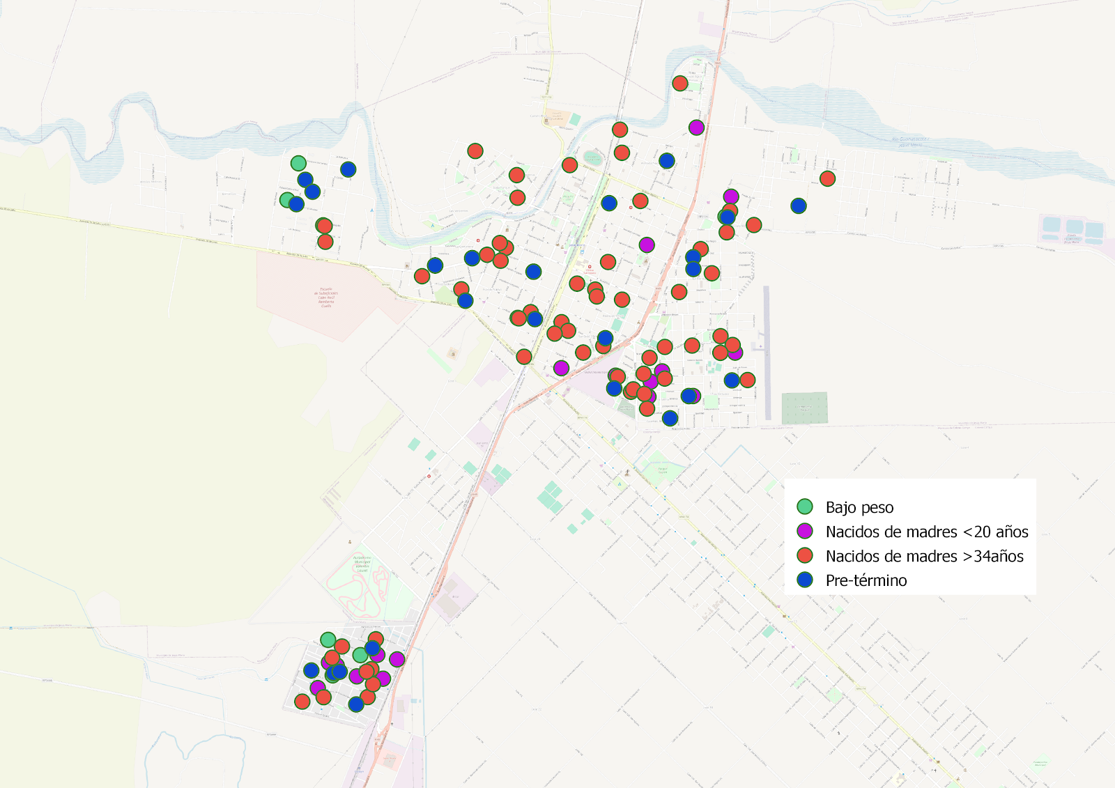 Este mapa muestra la distribución espacial de indicadores de salud en la ciudad de Jesús María, Córdoba, correspondientes al informe de salud del año 2024. Se incluyen datos sobre bajo peso al nacer, nacimientos de madres menores de 20 años, nacimientos de madres mayores de 34 años y nacimientos prematuros. Cada indicador está representado por un punto con un color distintivo. |