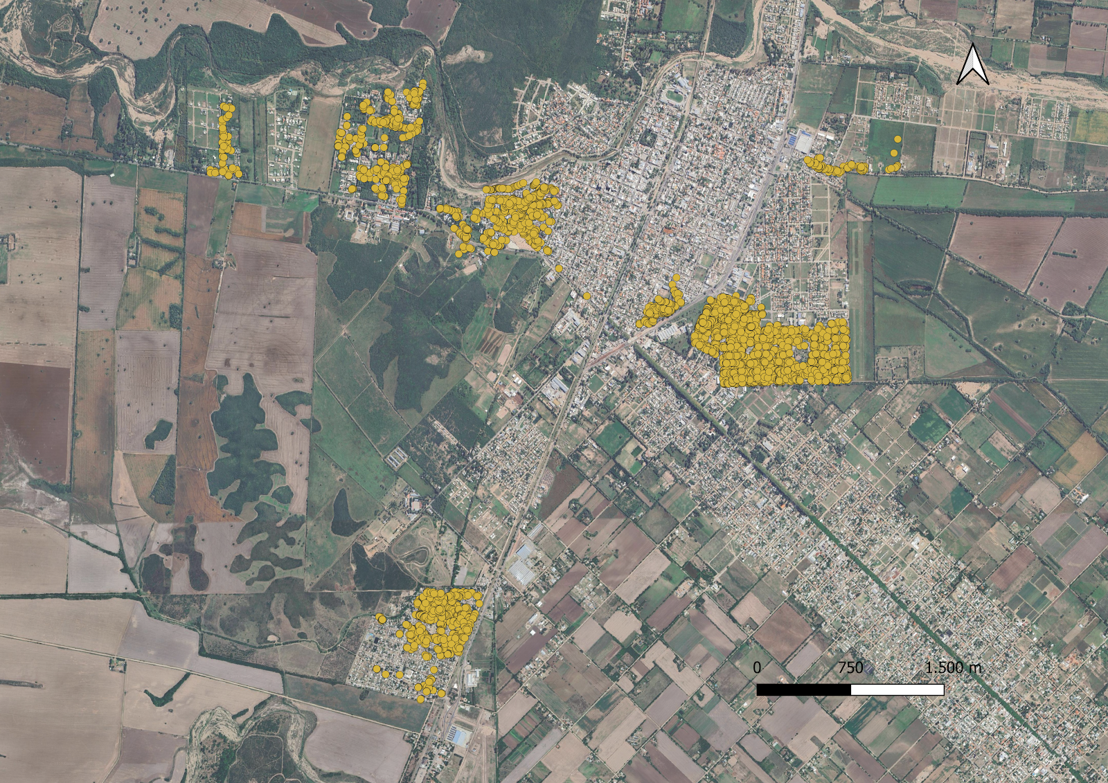 Este mapa muestra la ubicación de los puntos de vacunación canina durante la campaña realizada en la ciudad de Jesús María, Córdoba. Cada punto de vacunación está representado por un punto amarillo en el mapa. |