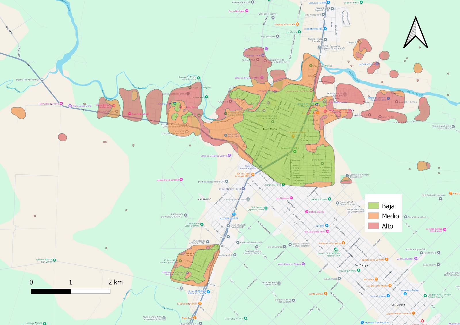 Este mapa muestra las zonas de riesgo de incendios en la ciudad de Jesús María, Córdoba. Las zonas de riesgo están clasificadas en tres niveles: Bajo, Medio y Alto, representadas por diferentes colores. Se incluye una leyenda con la clasificación de riesgo. |