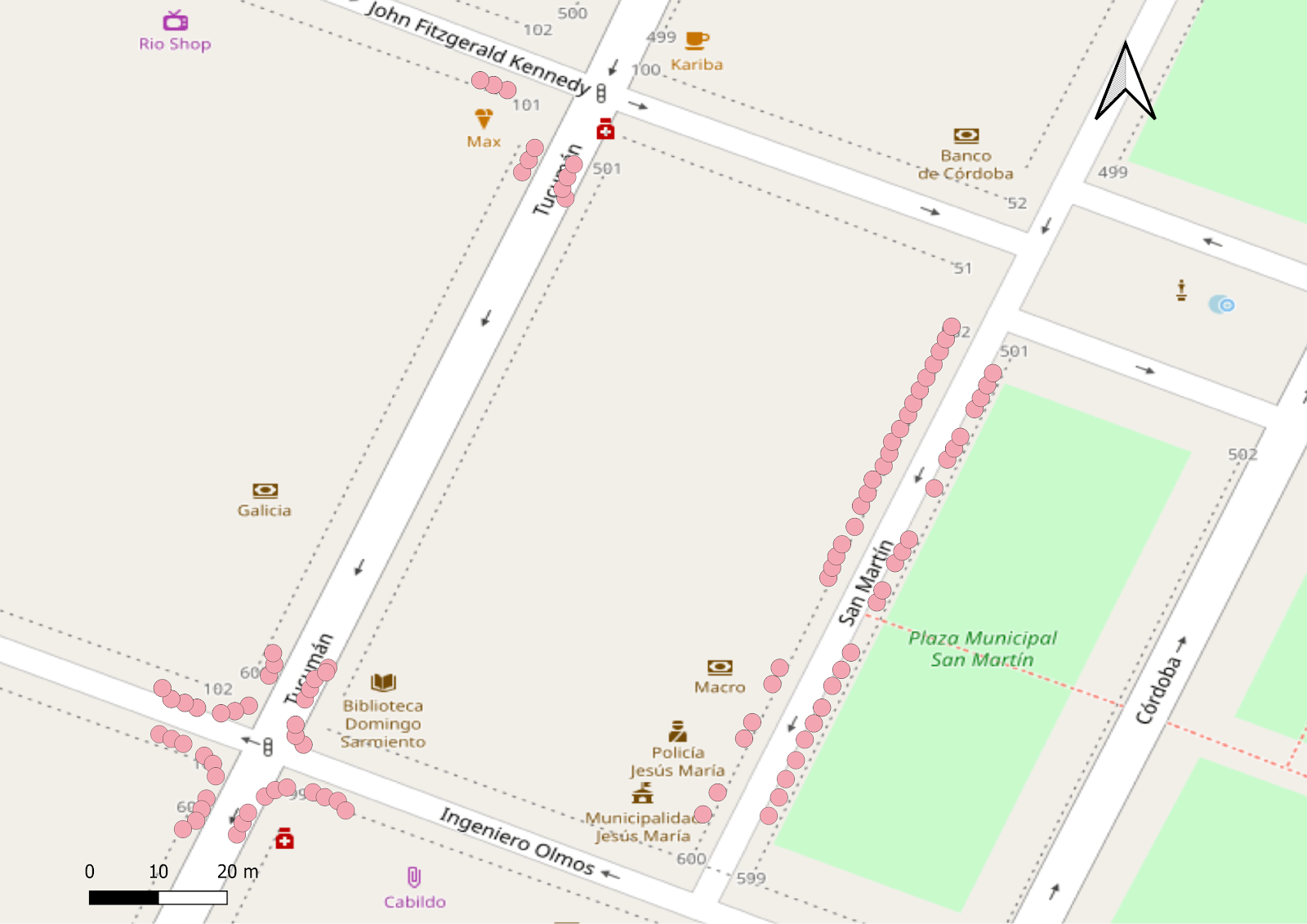 Este mapa muestra la ubicación de los bolardos en la ciudad de Jesús María, Córdoba. Los bolardos están representados por puntos de color rosa. Se incluye información sobre la ubicación y el número de identificación de cada bolardo. |