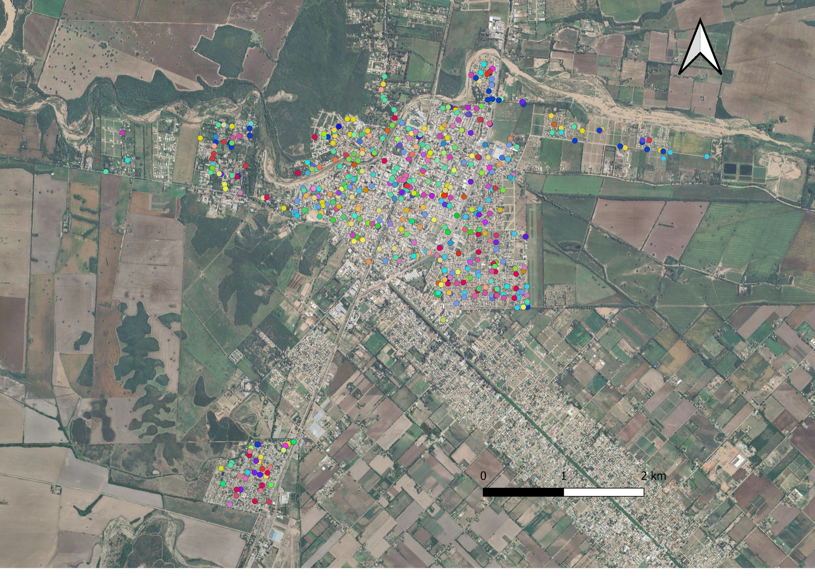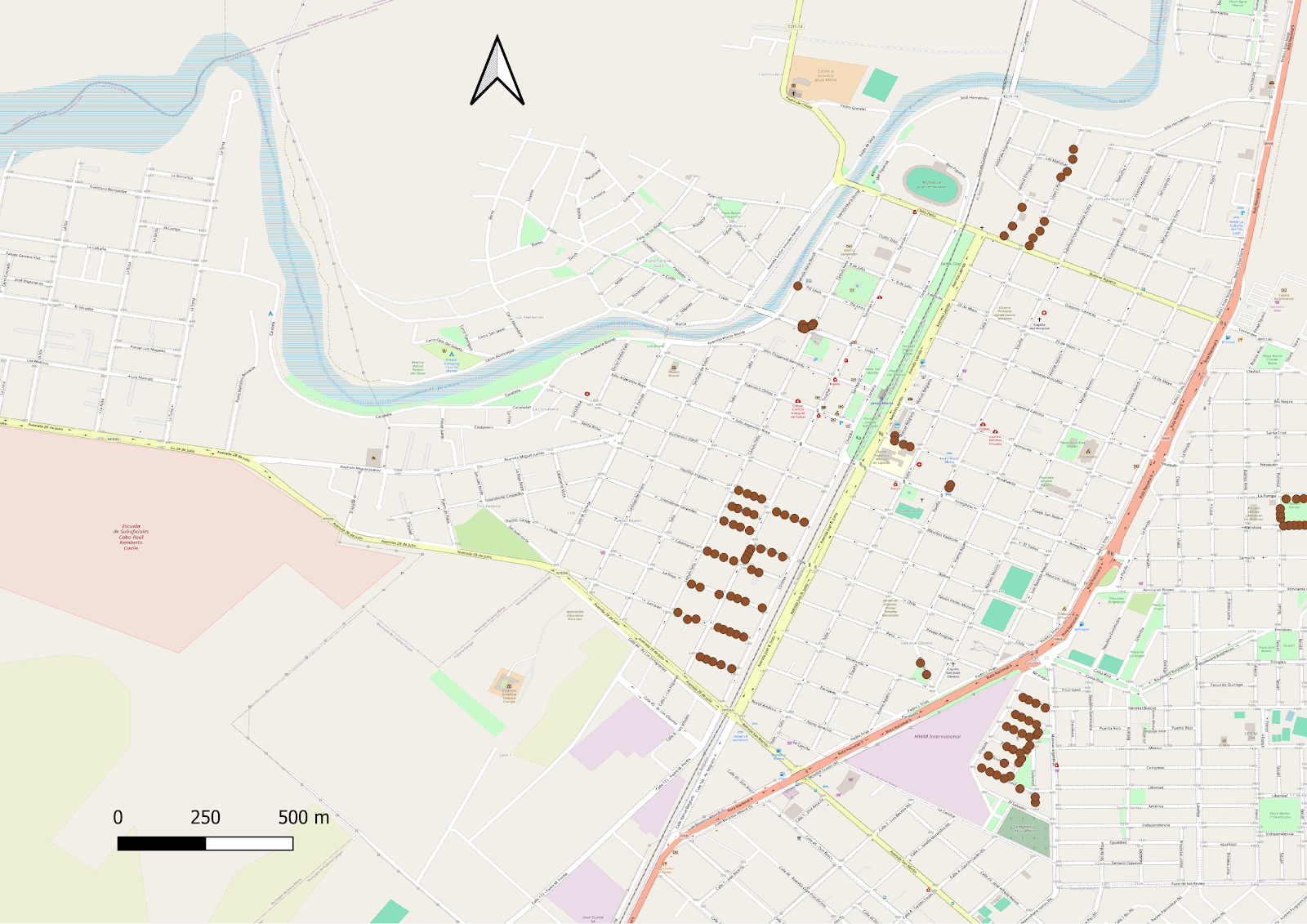 Este mapa muestra la ubicación de reclamos realizados por los ciudadanos en la ciudad de Jesús María, Córdoba. Los reclamos están agrupados por área (por ejemplo, alumbrado público, recolección de residuos, baches) y por tipo (por ejemplo, falta de alumbrado, acumulación de basura, calles en mal estado). Cada reclamo está representado por un punto de color diferente según el área y el tipo. Se incluye una leyenda detallada con la clasificación de los reclamos. |