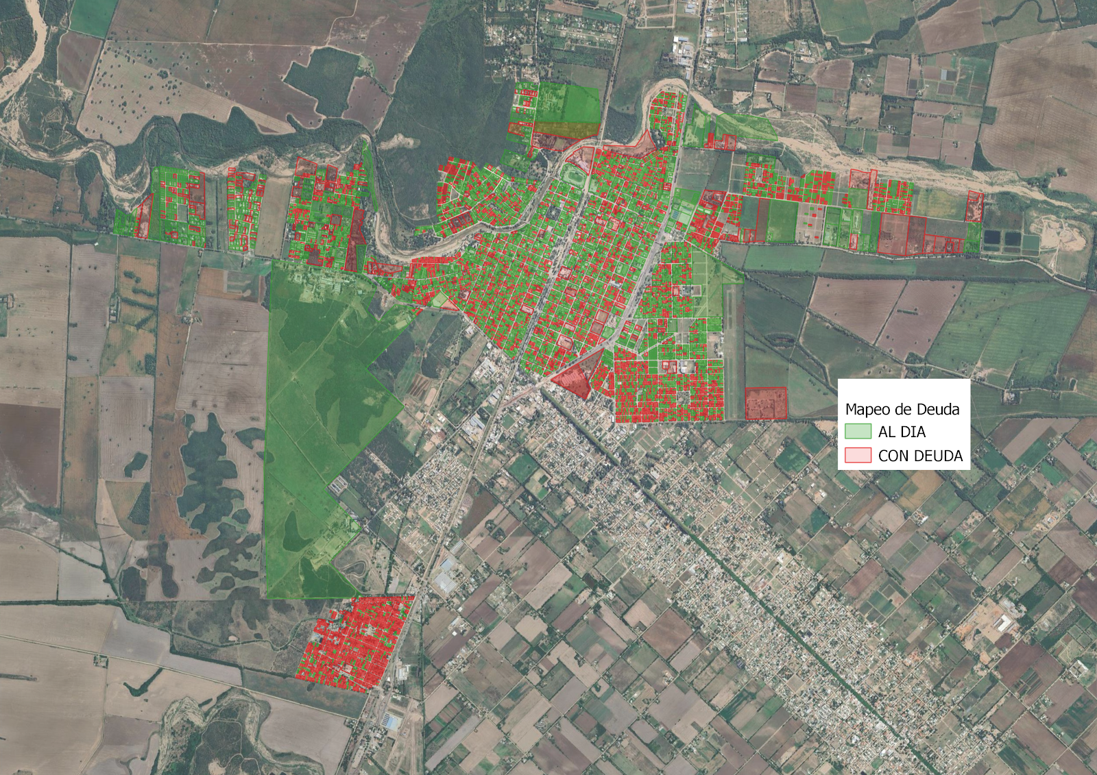Este mapa muestra la situación de deuda de los usuarios de OSJM (Obras Sanitarias Jesús María) en la ciudad de Jesús María, Córdoba. Las parcelas en verde indican que están al día con el pago, mientras que las parcelas en rojo indican que tienen deuda. |