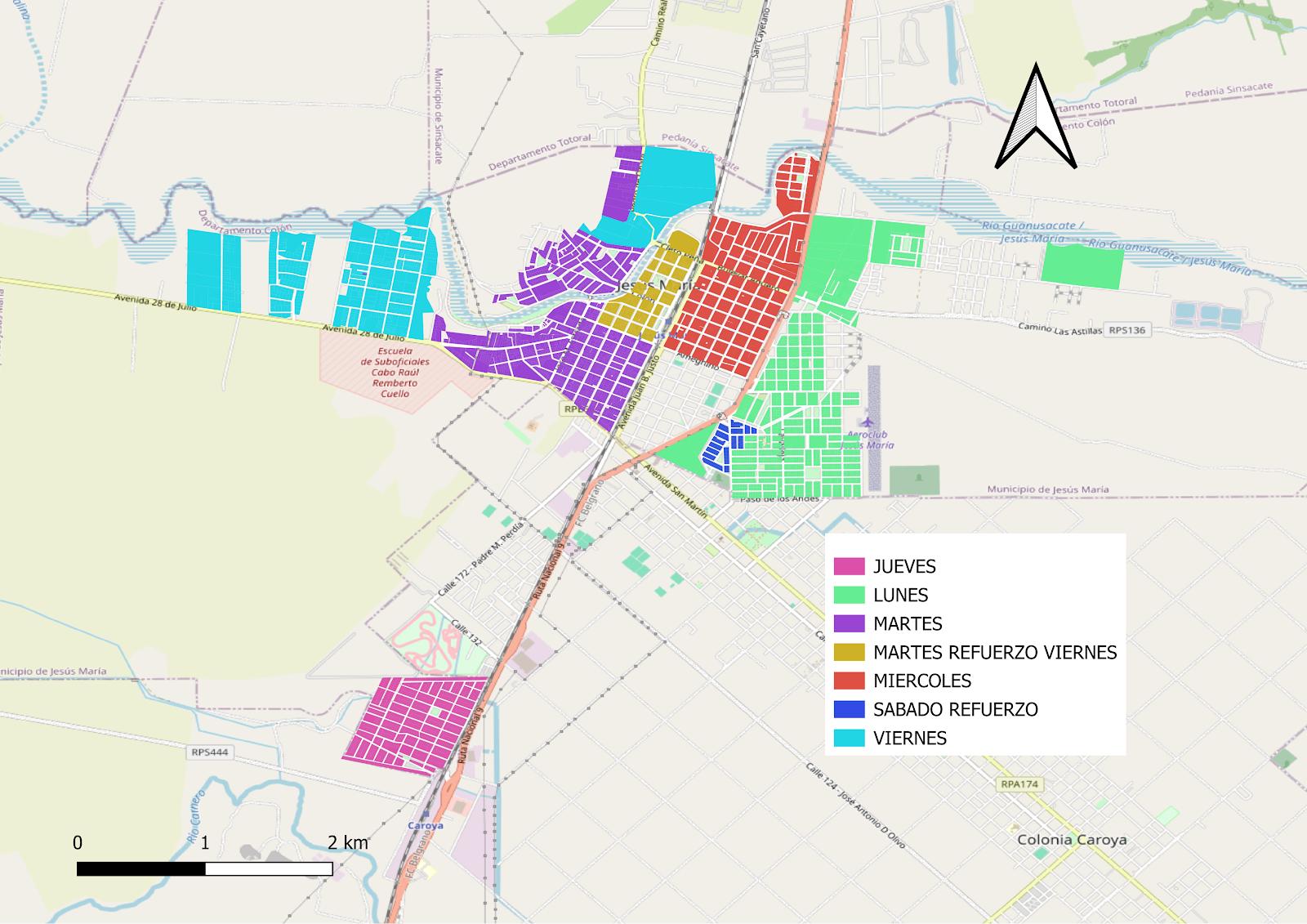 Mapa esquemático de los días de recolección de residuos domiciliarios en la ciudad de Jesús María, Córdoba, Argentina. Incluye las zonas de recolección regular y de refuerzo por día de la semana. |