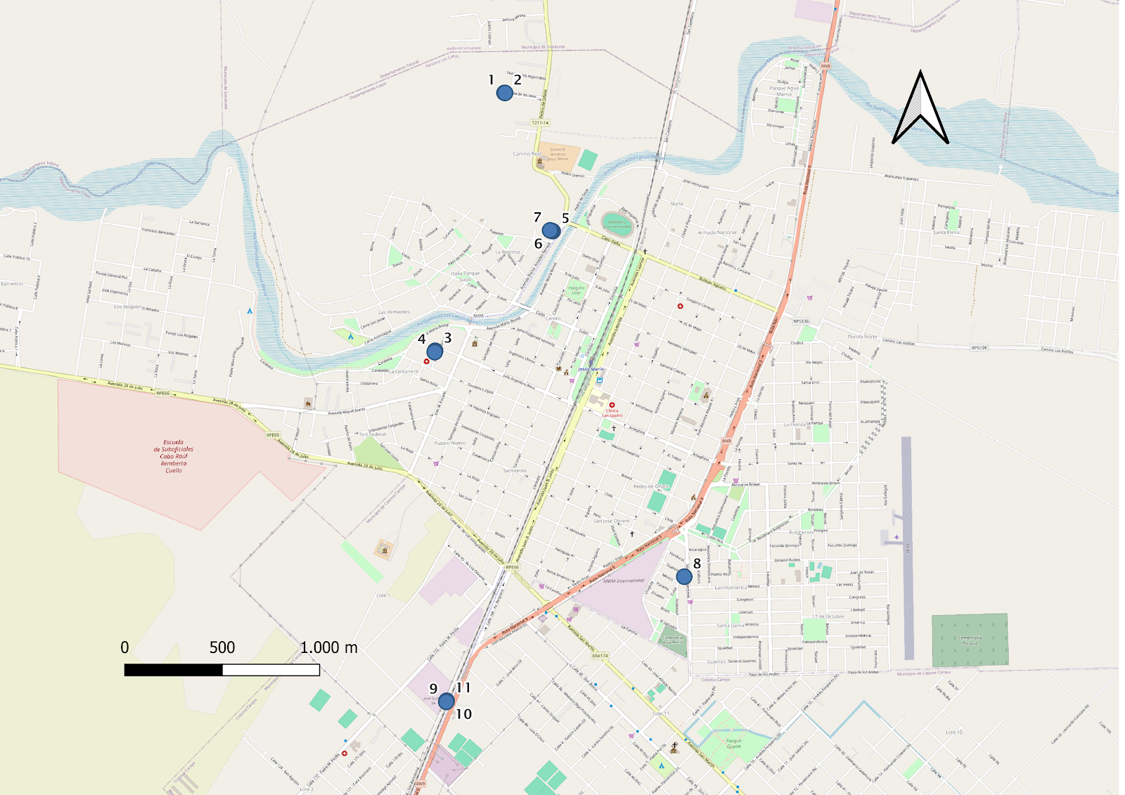 Este mapa muestra la ubicación de las bombas eléctricas en la ciudad de Jesús María, Córdoba. Las bombas eléctricas están representadas por puntos numerados. Se incluye una leyenda con la numeración correspondiente a cada bomba eléctrica. |