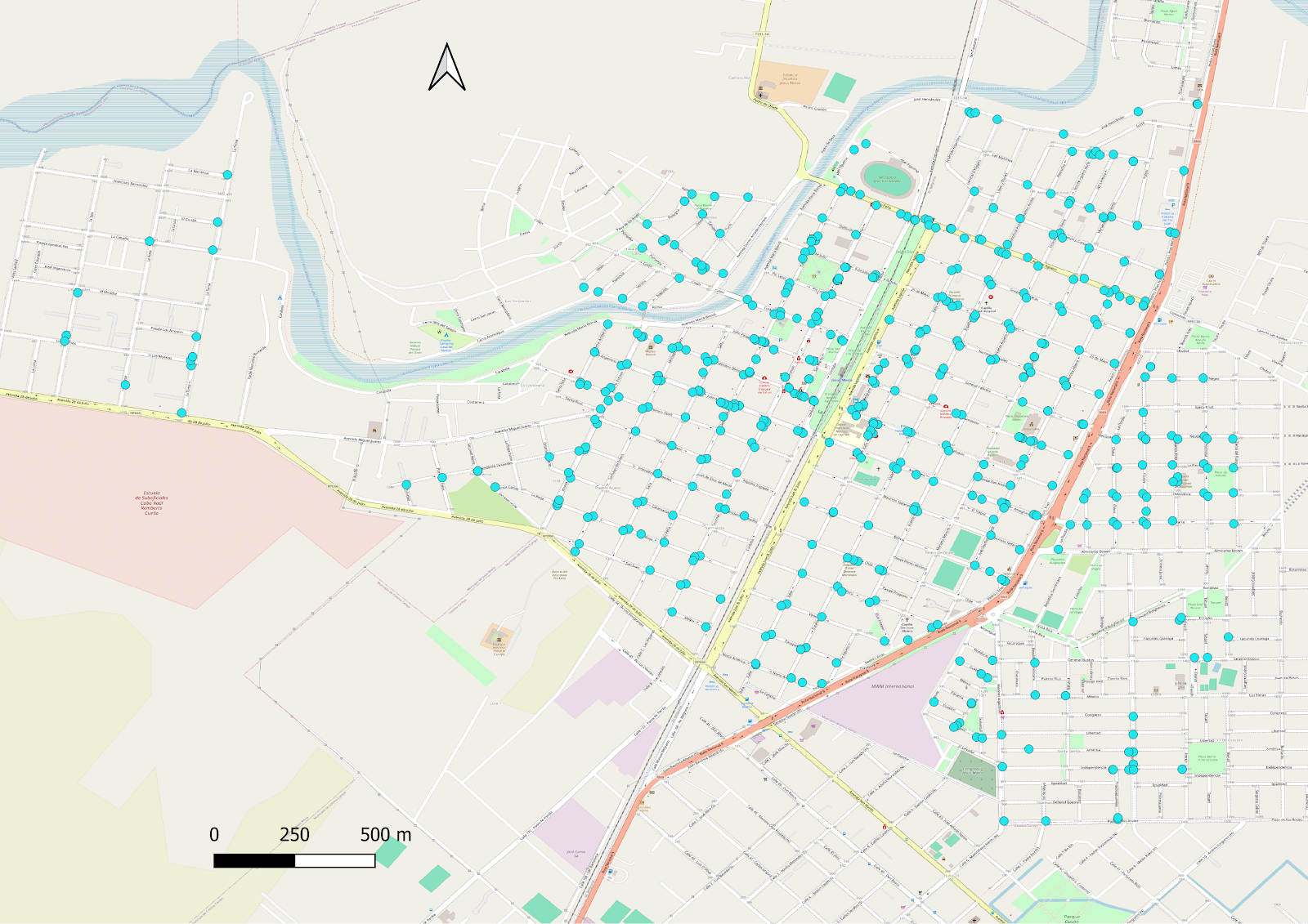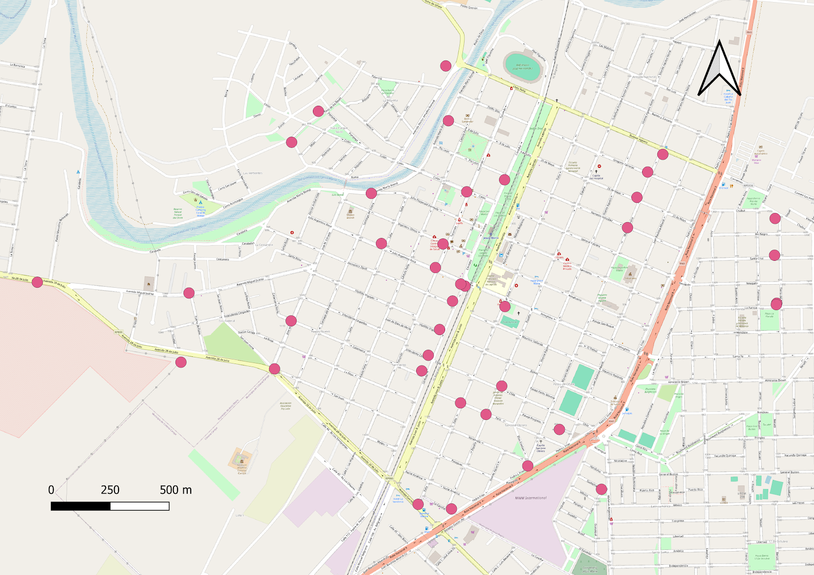 Este mapa muestra la ubicación de las cámaras de desagües en la ciudad de Jesús María, Córdoba. Las cámaras de desagües están representadas por puntos de color rosa. Se incluye una leyenda con la numeración correspondiente a cada cámara de desagüe. |