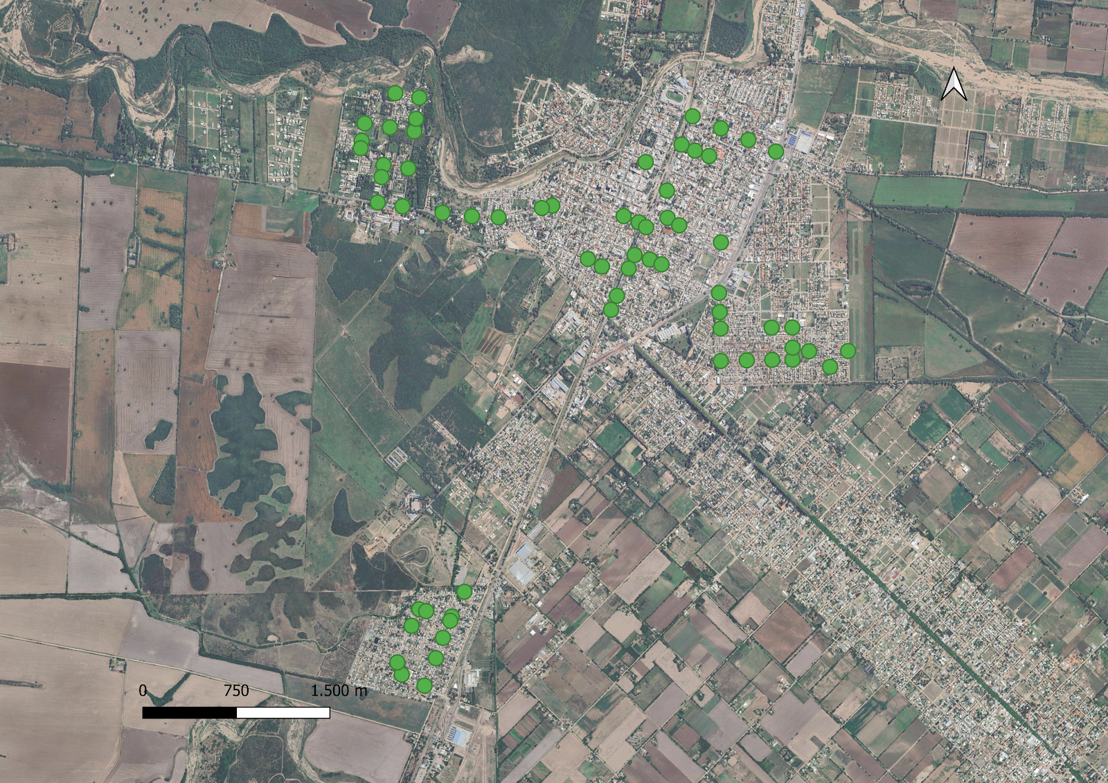 Este mapa muestra la ubicación de las paradas de autobús en la ciudad de Jesús María, Córdoba. Cada parada de autobús está representada por un punto verde en el mapa. |
