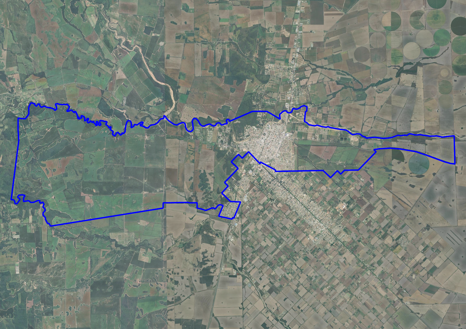 Este mapa muestra el límite del ejido municipal de la ciudad de Jesús María, Córdoba. El límite está representado por un polígono azul en el mapa. |