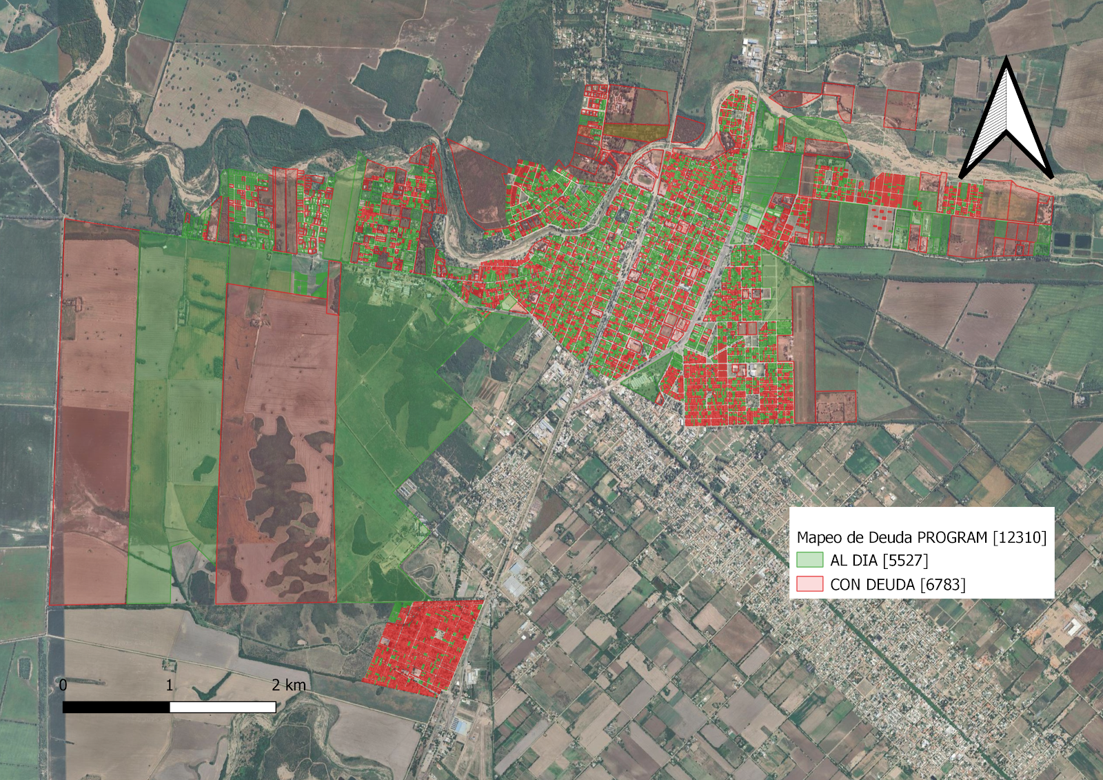 Este mapa muestra la situación de deuda del impuesto inmobiliario de las parcelas en la ciudad de Jesús María, Córdoba. Las parcelas en verde indican que están al día con el pago, mientras que las parcelas en rojo indican que tienen deuda. |