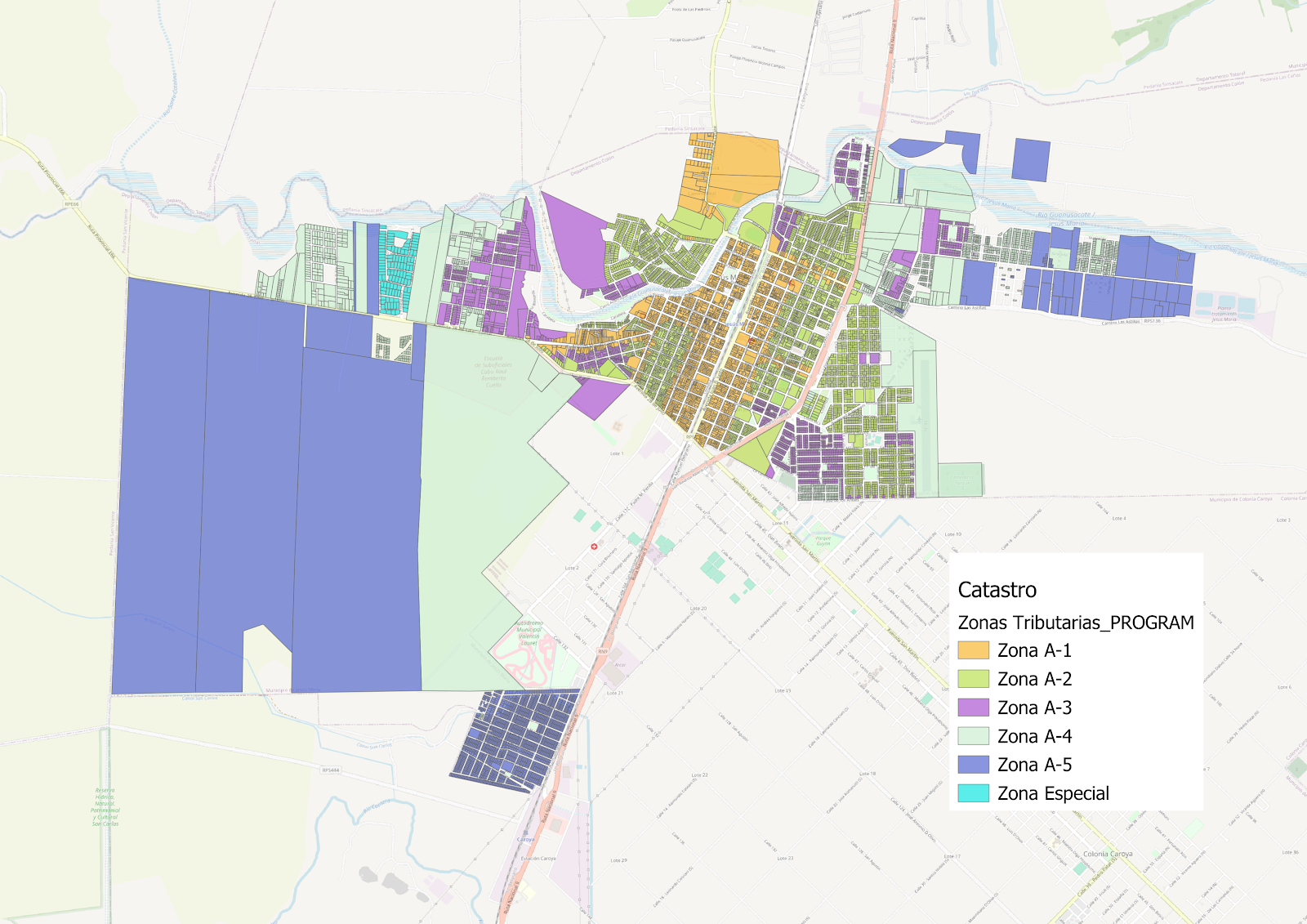 Este mapa muestra la división de la ciudad de Jesús María en diferentes zonas tributarias, utilizadas para determinar el valor del impuesto inmobiliario. Cada zona está representada por un color y una etiqueta específica. |
