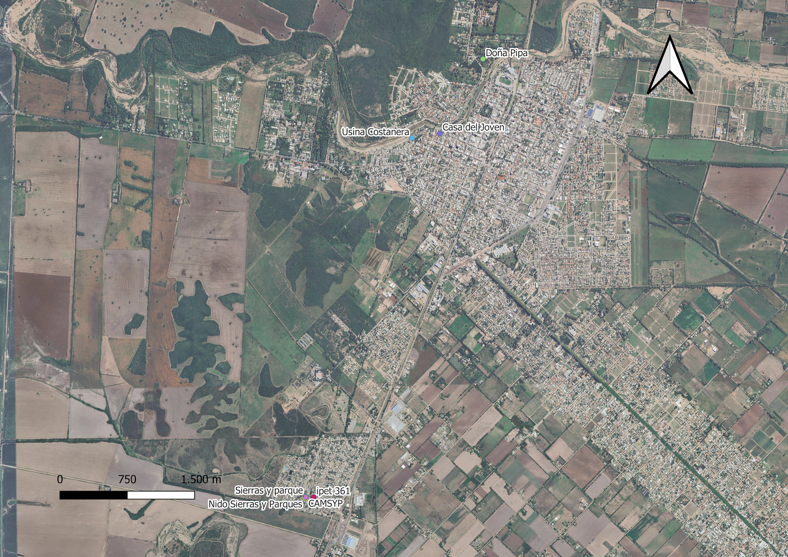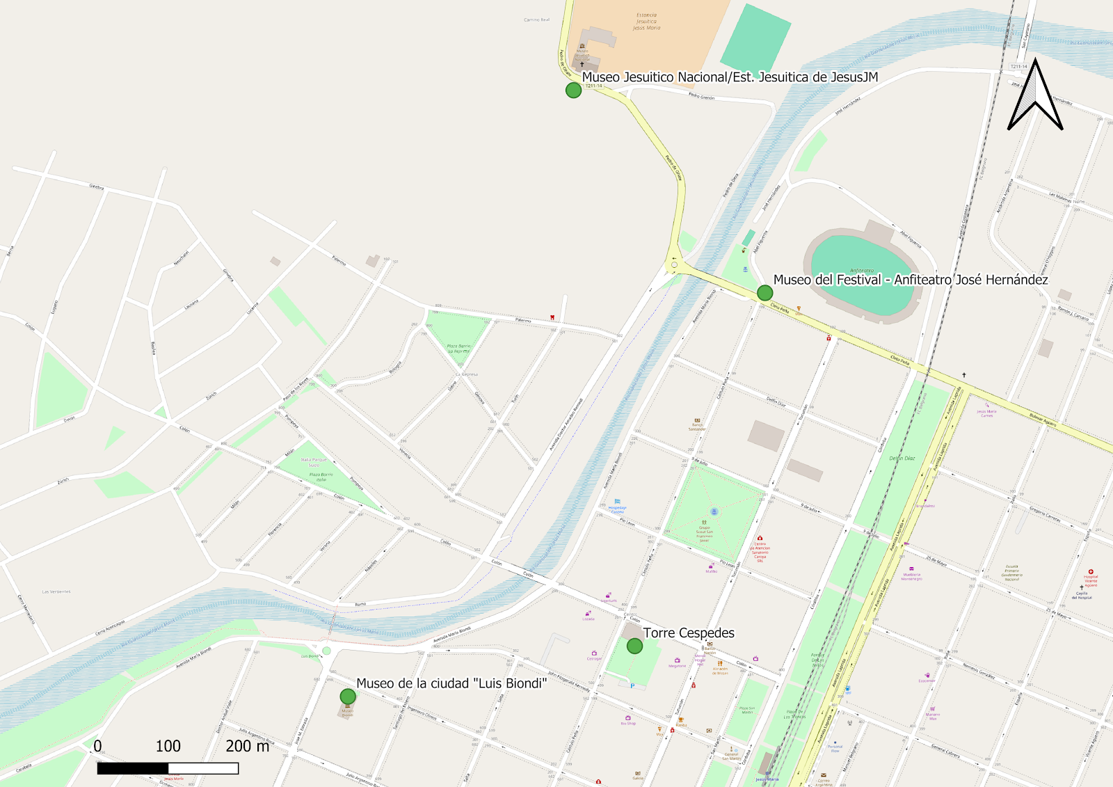 Este mapa muestra la ubicación de los museos dentro del ejido de la ciudad de Jesús María, Córdoba. Los museos están representados por puntos con sus respectivos nombres. Se incluye una leyenda con la numeración correspondiente a cada museo. |