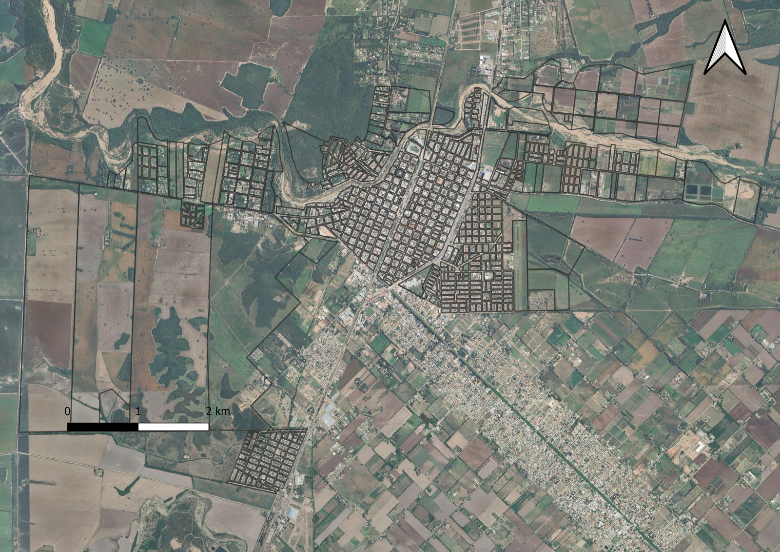 Este mapa muestra la división de la ciudad de Jesús María en manzanas catastrales. Cada manzana está representada por un polígono negro en el mapa. |