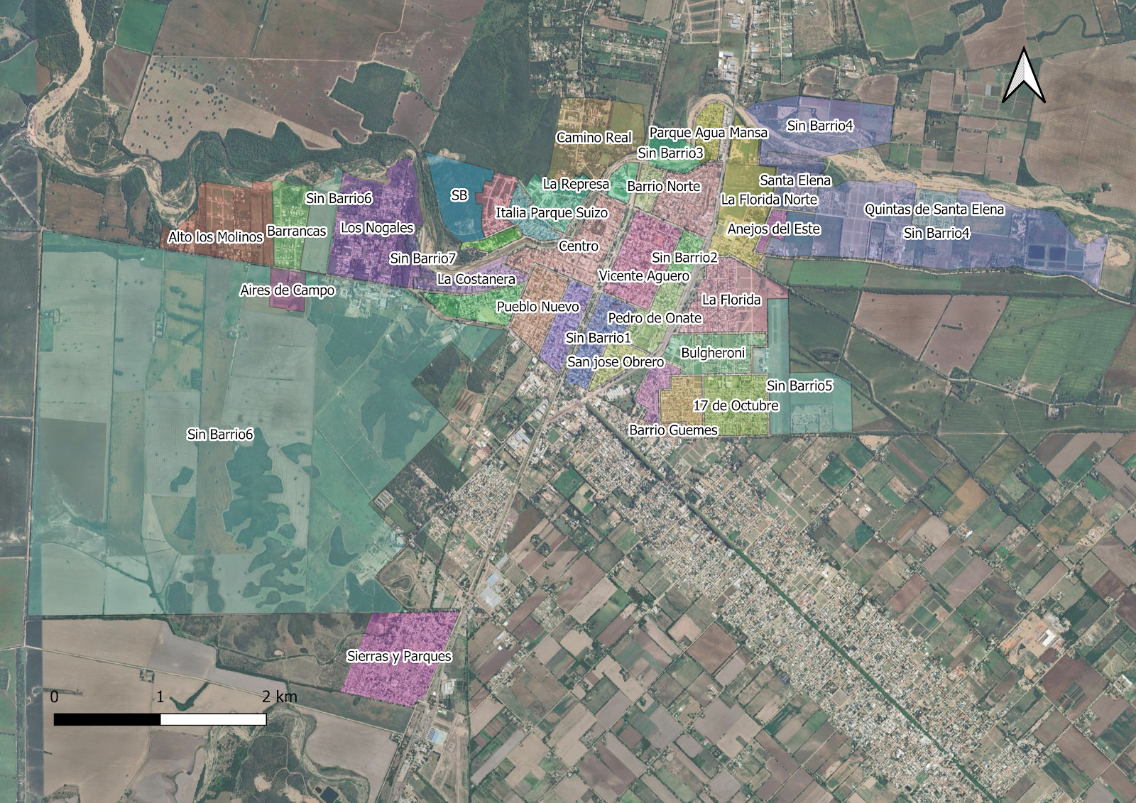 Este mapa muestra la delimitación de los barrios de la ciudad de Jesús María, Córdoba. Cada barrio está representado por un polígono con un color diferente y su nombre correspondiente. |