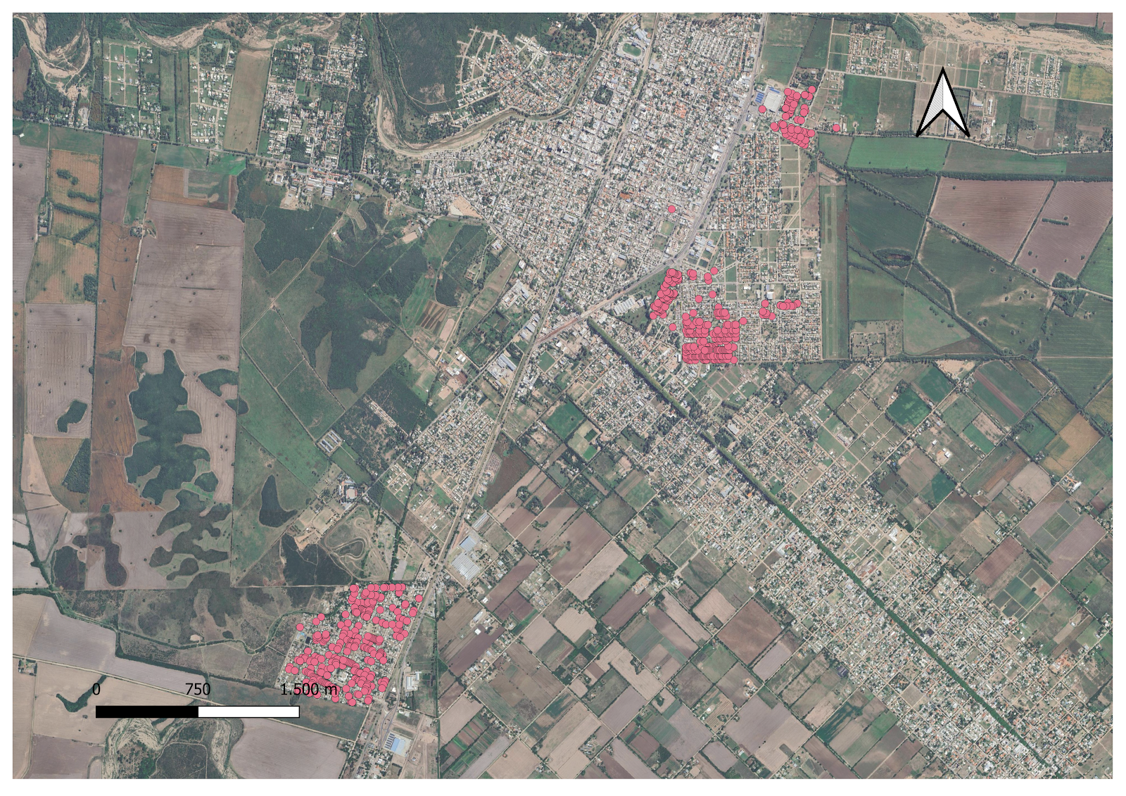 Este mapa muestra la distribución espacial de la terminalidad educativa en la ciudad de Jesús María, Córdoba, para el año 2016. Cada punto rojo representa una vivienda donde al menos un miembro del hogar finalizó sus estudios secundarios en el año 2016. |