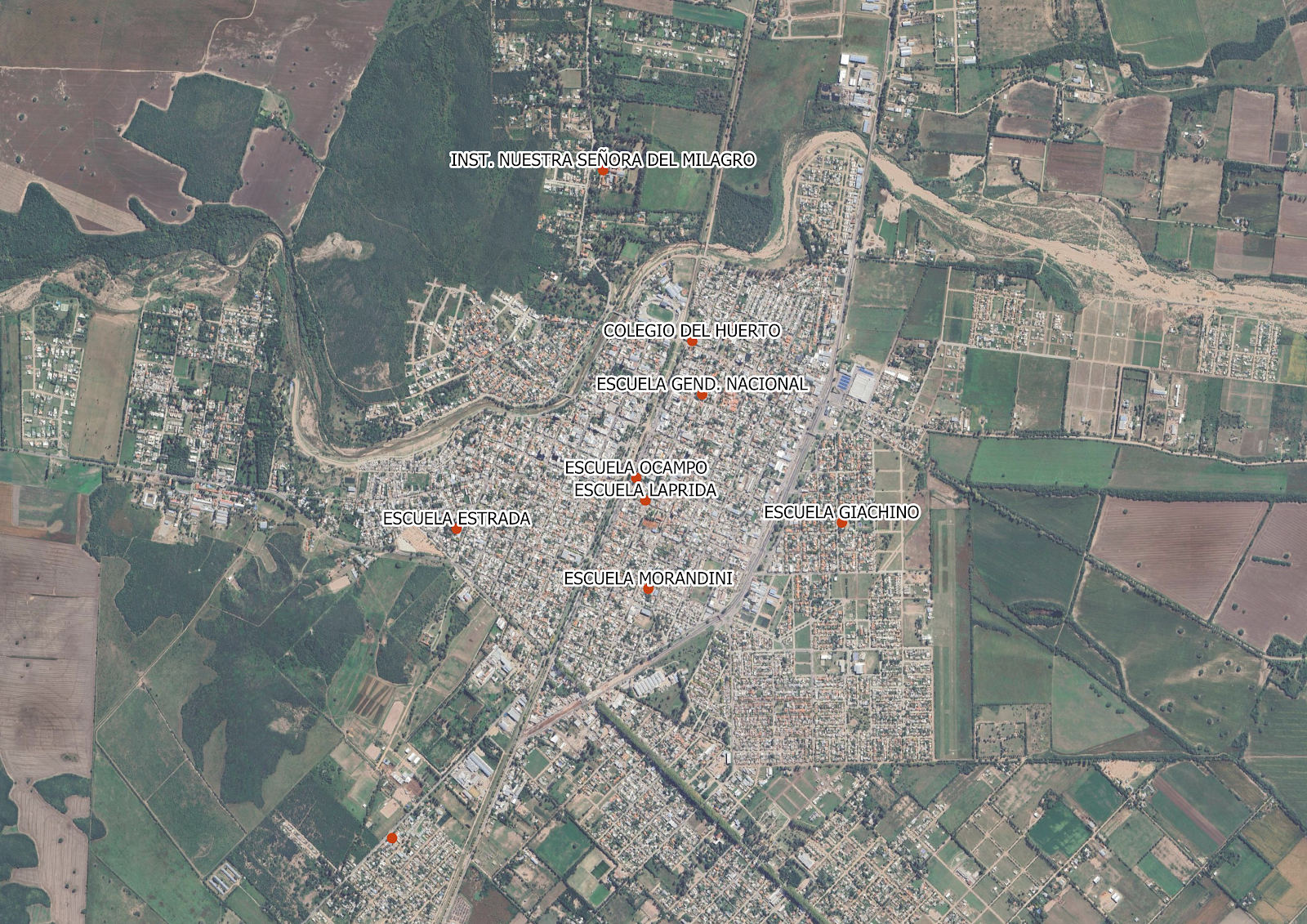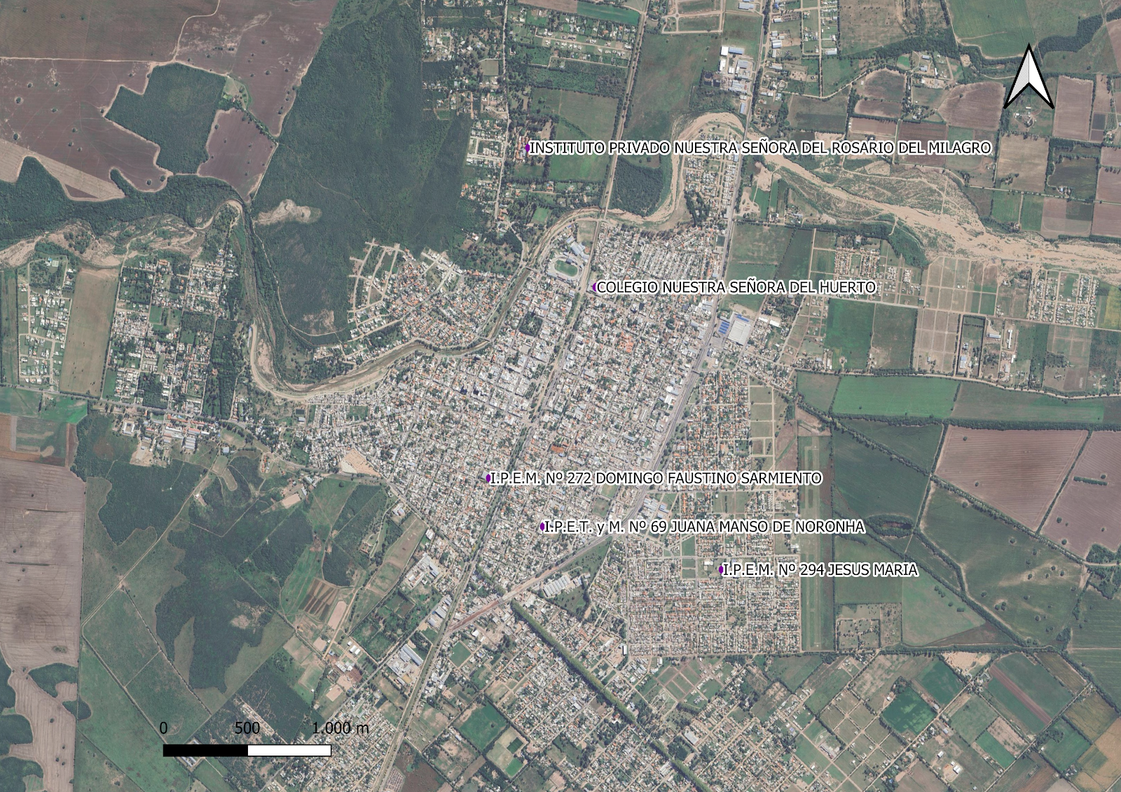 Este mapa muestra la ubicación de las escuelas secundarias en la ciudad de Jesús María, Córdoba. Cada escuela secundaria está representada por un punto en el mapa, y se incluye información sobre su nombre. |