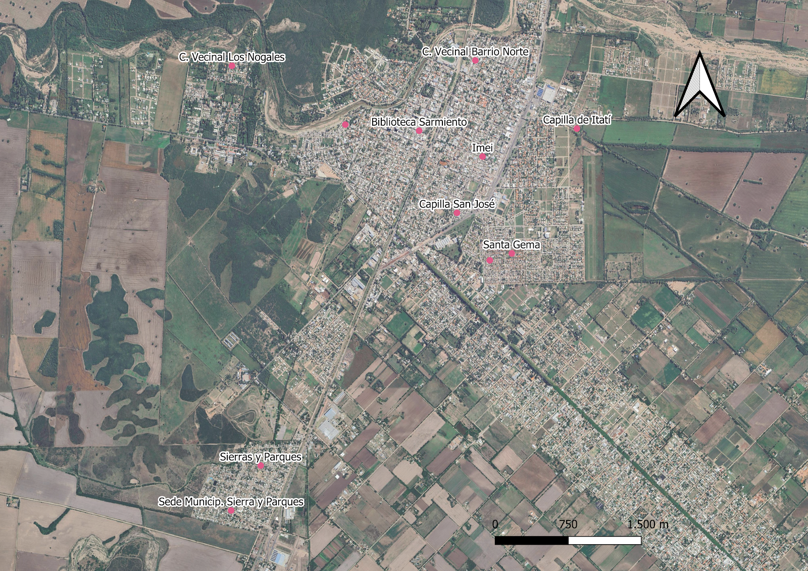 Este mapa muestra la ubicación de los centros de apoyo escolar disponibles en la ciudad de Jesús María, Córdoba. Cada centro de apoyo escolar está representado por un punto rojo en el mapa, acompañado de su nombre correspondiente. |