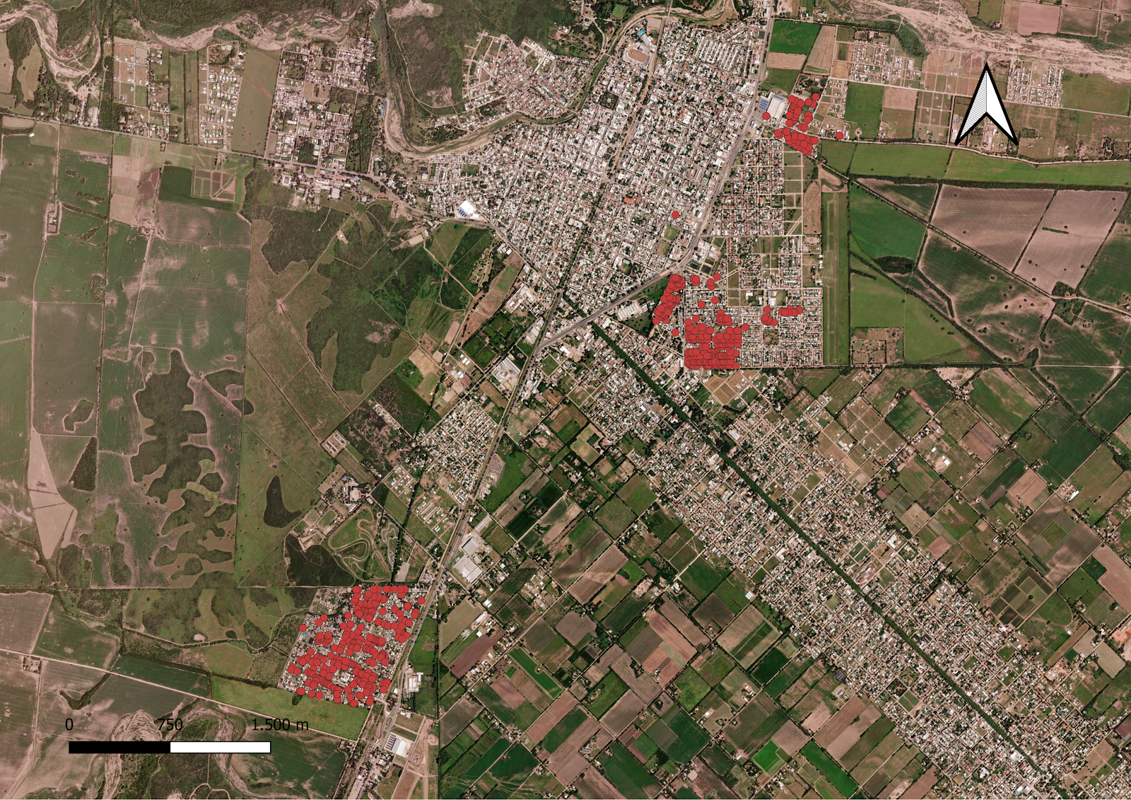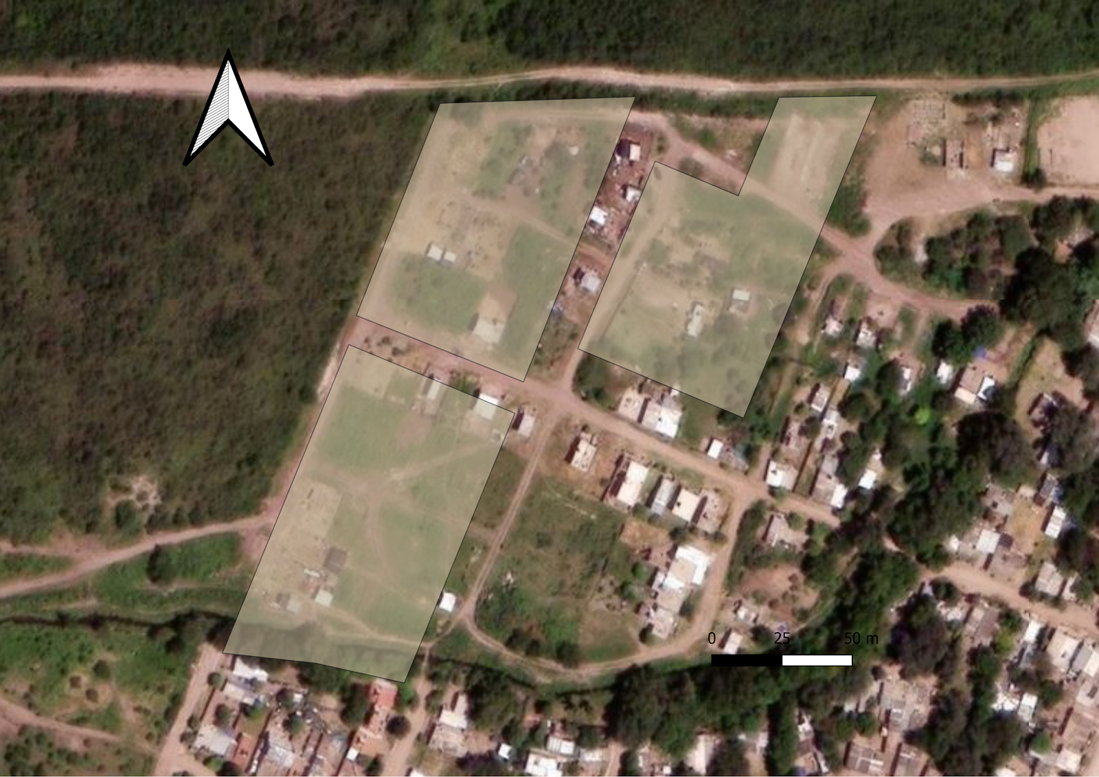 Este mapa muestra la ubicación de los lotes destinados al proyecto de escuelas en la ciudad de Jesús María, Córdoba. Los lotes están representados por polígonos de color gris claro. Se incluye una leyenda con la clasificación de los lotes por su designación para el proyecto de escuelas. |