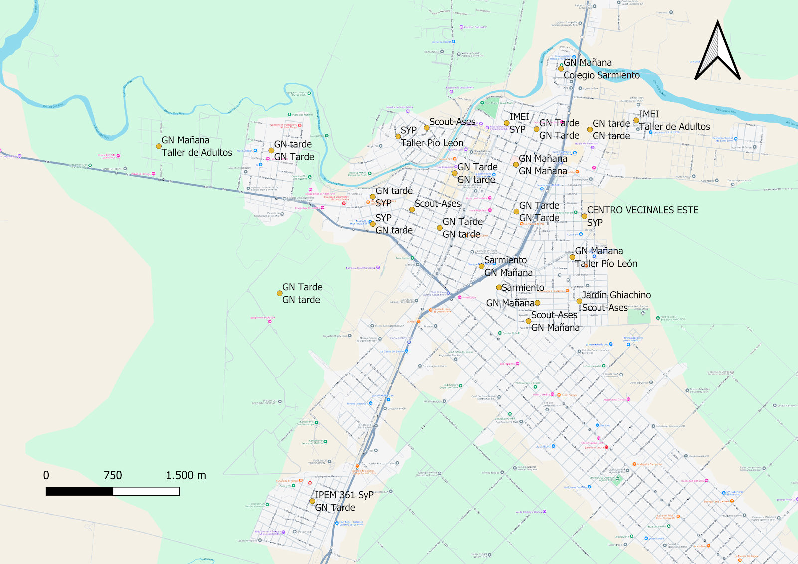 Este mapa muestra la ubicación de los talleres que forman parte del proyecto JM Proyecta en la ciudad de Jesús María, Córdoba. Los talleres están clasificados por tipo (GN Mañana, GN Tarde, Taller de Adultos, Scout-Ases, SYP, etc.) y representados por diferentes colores y abreviaturas. Se incluye una leyenda detallada con la descripción de cada tipo de taller. |